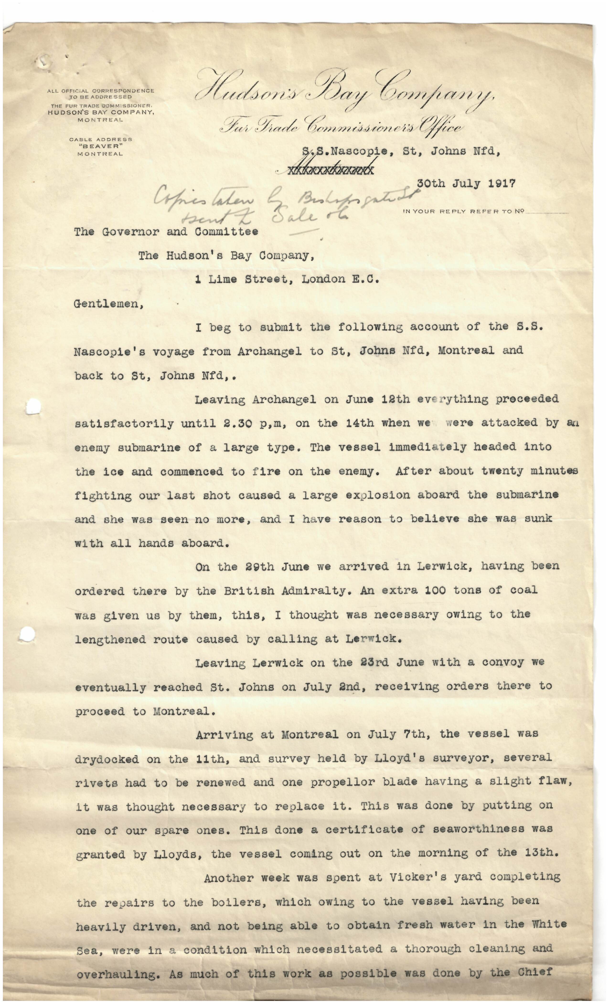 I am commanded by My Lords Commissioners of the Admiralty to acquaint you that they have had under consideration a report of the encounter of the Company’s S.S.Nascopie with an enemy submarine on June 14th.
