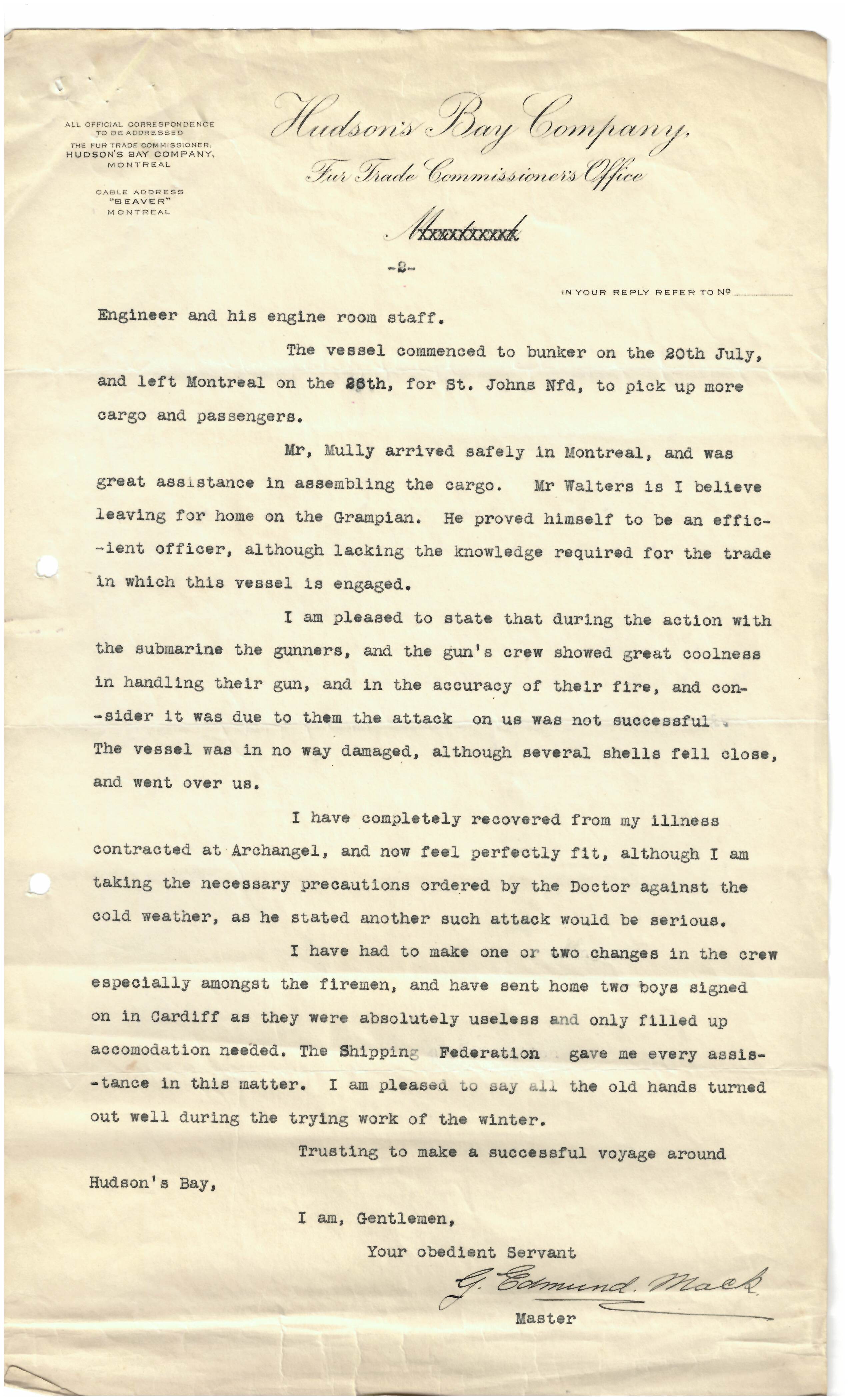 Transcription of letter from Captain Mack to the Governor and Committee of the Hudson’s Bay Company. Hudson's Bay Company Archives, Archives of Manitoba, Governor and Committee general inward correspondence, 1911-1923, HBCA A.10/189a.