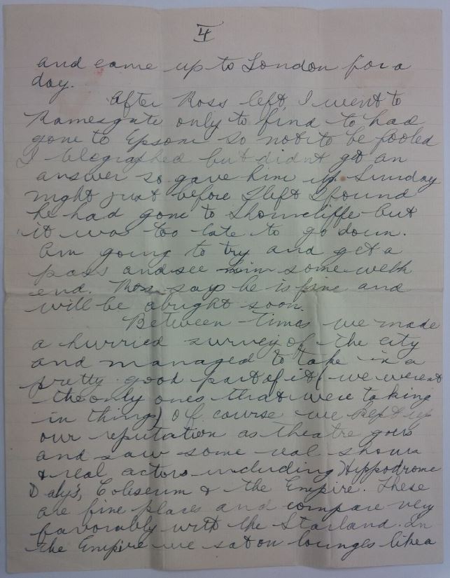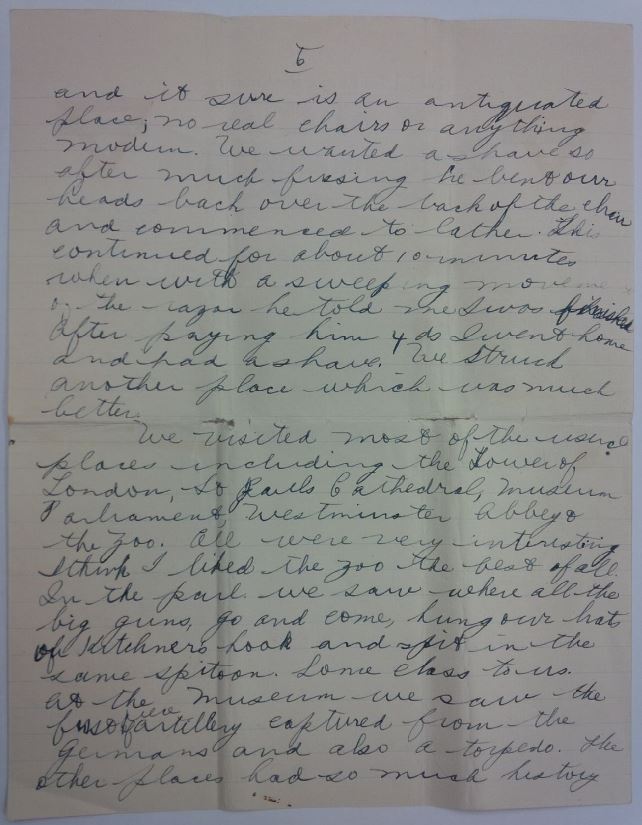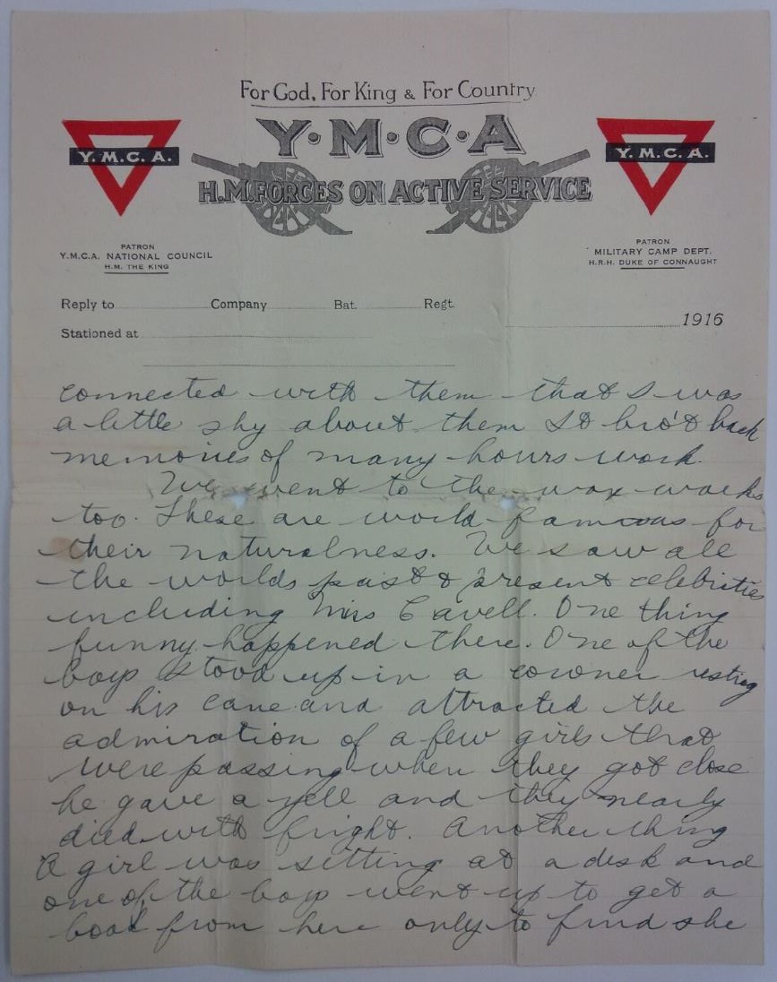 “We went to the wax works too. These are world famous for their naturalness. We saw all the worlds past & present celebrities including Miss Cavell. One thing funny happened there. One of the boys stood up in a corner resting on his cane and attracted the admiration of a few girls that were passing when they got close he gave a yell and they nearly died with fright.”