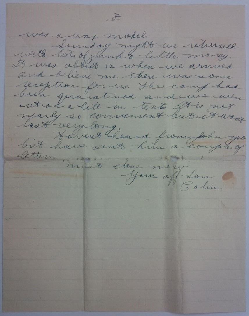 Colin Black served in France with the Canadian Mounted Rifles from March to August 1917. He was hospitalized with diphtheria in August 1917 in France and was then transferred to hospital in England. Black did not fully recover and was discharged from the army in March 1918.