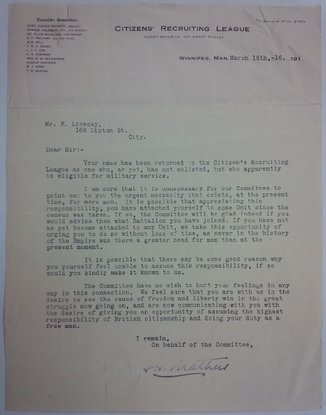 After much controversy and debate, conscription was enacted in Canada in August 1917. Before that some governments, individuals and groups actively encouraged men to enlist voluntarily. The Citizens’ Recruiting League, headed by several prominent Winnipeggers including Chief Justice Thomas Mathers, was one such organization.