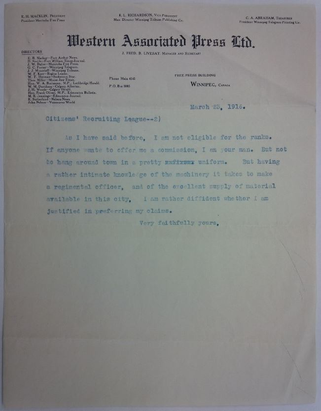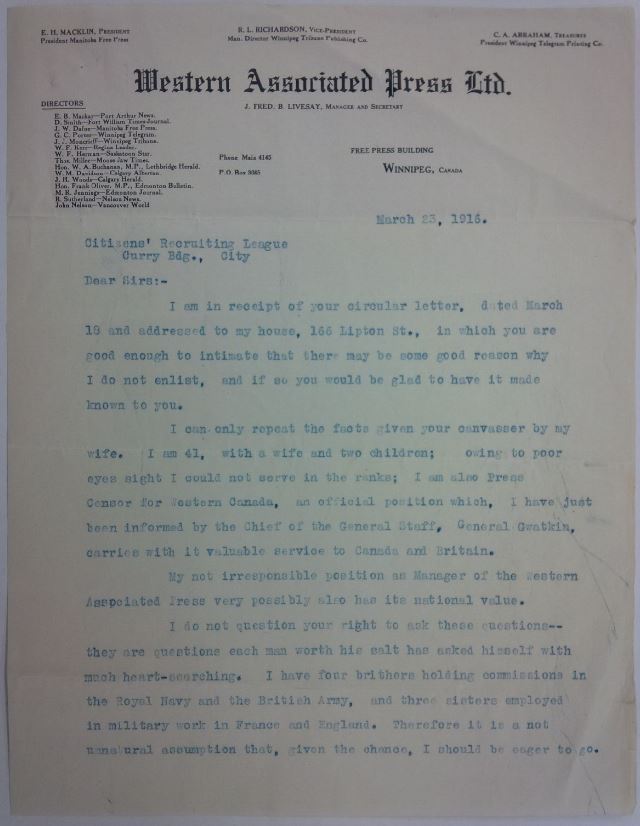 A 41-year-old husband and father of two, Livesay responded that he was ineligible to serve in the ranks due to poor eyesight, and had not been offered a commission. Furthermore, he suggested that he was serving his country through his work as press censor for Western Canada and manager of the Western Associated Press.