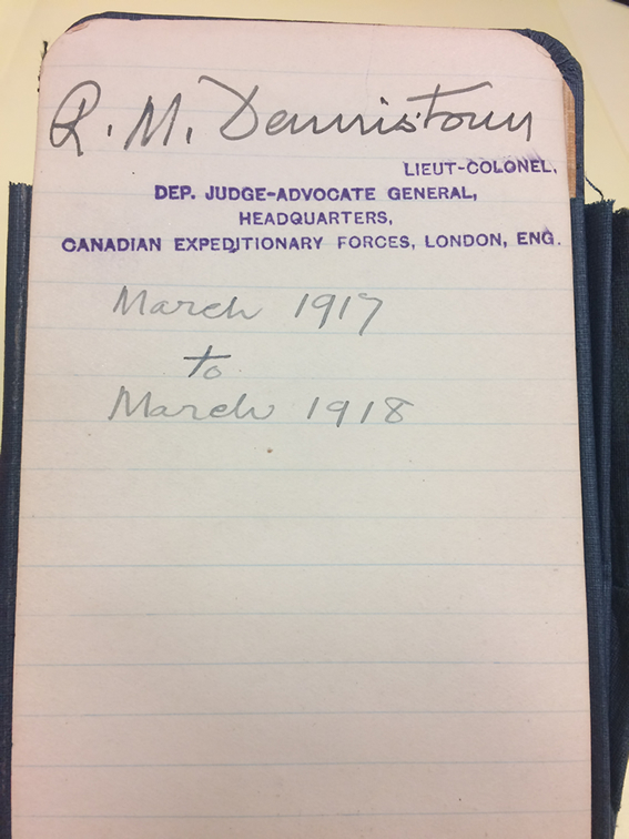 After the war R. M. Dennistoun was appointed a judge in the Manitoba Court of Appeal. Dennistoun served as a Court of Appeal judge for 28 years until his retirement in 1946. He was well-respected and is remembered today, perhaps mostly in connection with his first Winnipeg home which has recently been demolished after attempts to save it by the heritage community. Dennistoun kept a diary from the start of the First World War until just before his death in 1952.