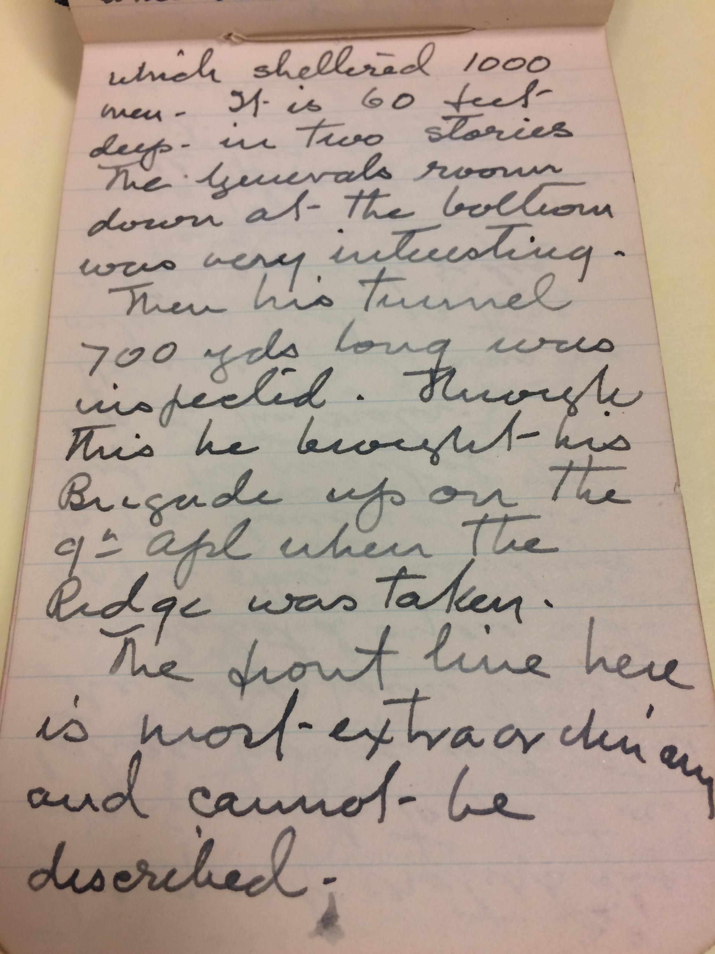 While in France, Dennistoun also had the opportunity to see Vimy Ridge and he writes of machine gun shelters that were 60 feet deep and 700 yard tunnels.