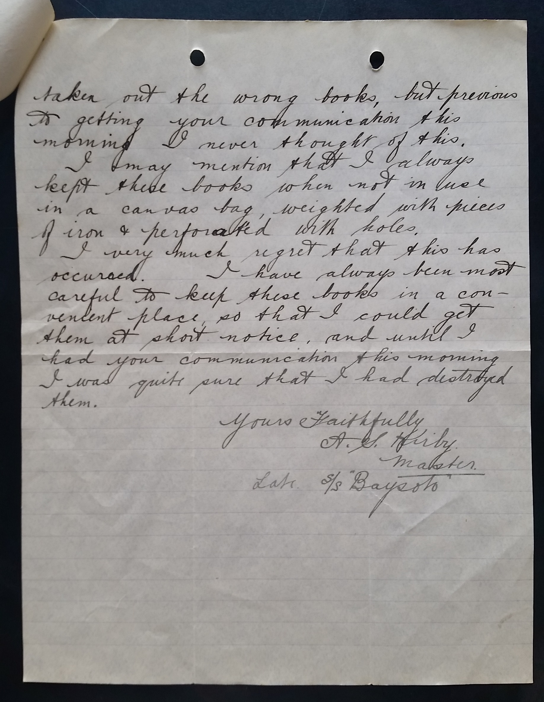 Four days later, Captain A.S. Kirby responded in a short, two page letter detailing his memory of the attack. In it, Kirby recounted how following being torpedoed, he went to his desk and took out what he thought were the confidential books and dropped them over the side.