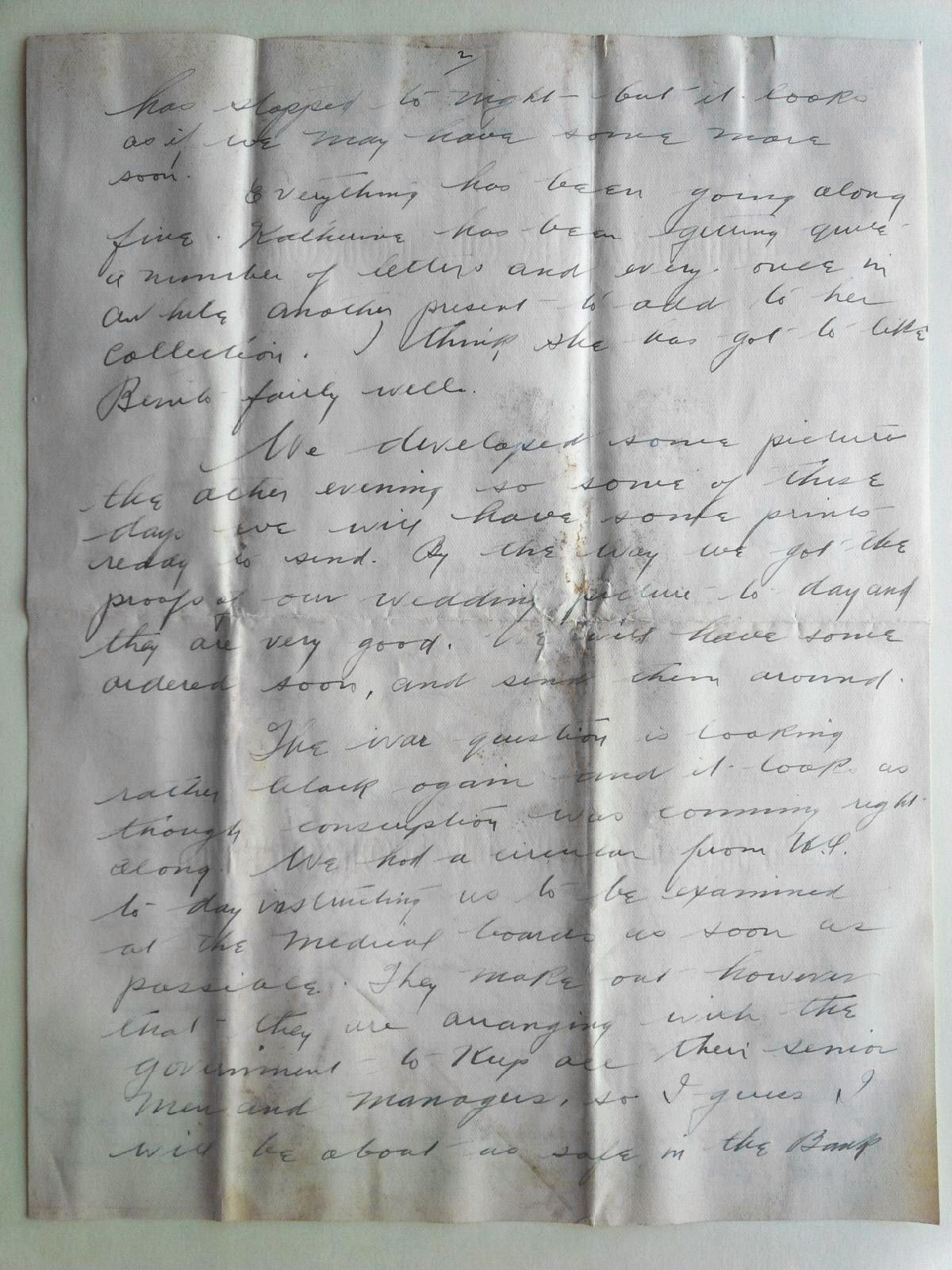 “The war question is looking rather black again and it looks as though conscription was coming right along. We had a circular from H. Q. today instructing us to be examined at the medical boards as soon as possible. They make out however that they are arranging with the government to keep all their senior men and managers, so I guess I will be about as safe in the Bank as anywhere else, so I guess there’s nothing to do but sit still and wait for things to take their own course.”
