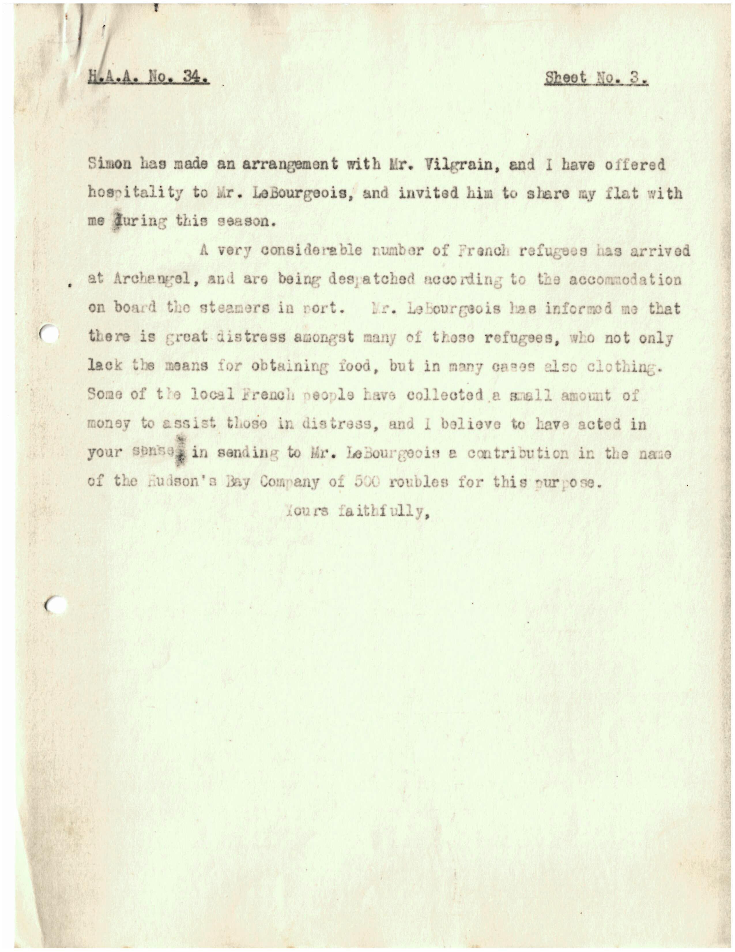 “A very considerable number of French refugees has arrived at Archangel, and are being despatched according to the accommodation on board the steamers in port. Mr. LeBourgeois has informed me that there is a great distress amongst many of these refugees, who not only lack the means for obtaining food, but in many cases also clothing. Some of the local French people have collected a small amount of money to assist those in distress, and I believe to have acted in your sense in sending to Mr. LeBourgeois a contribution in the name of the Hudson’s Bay Company of 500 roubles for this purpose.”