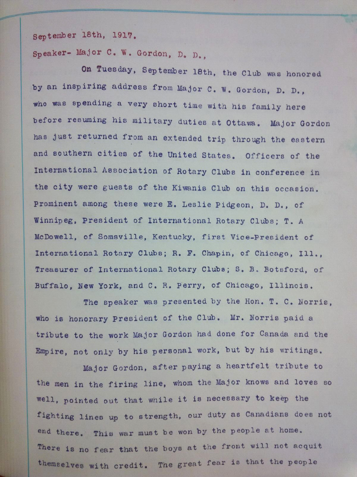 On 18 September 1917, the Kiwanis Club of Winnipeg hosted a luncheon and talk by Major C. W. Gordon, a well-known Winnipeg minister who wrote novels under the pen name Ralph Connor. One hundred and fifty men attended the luncheon at the Fort Garry Hotel; the event is described in the Kiwanis Club’s minute book.