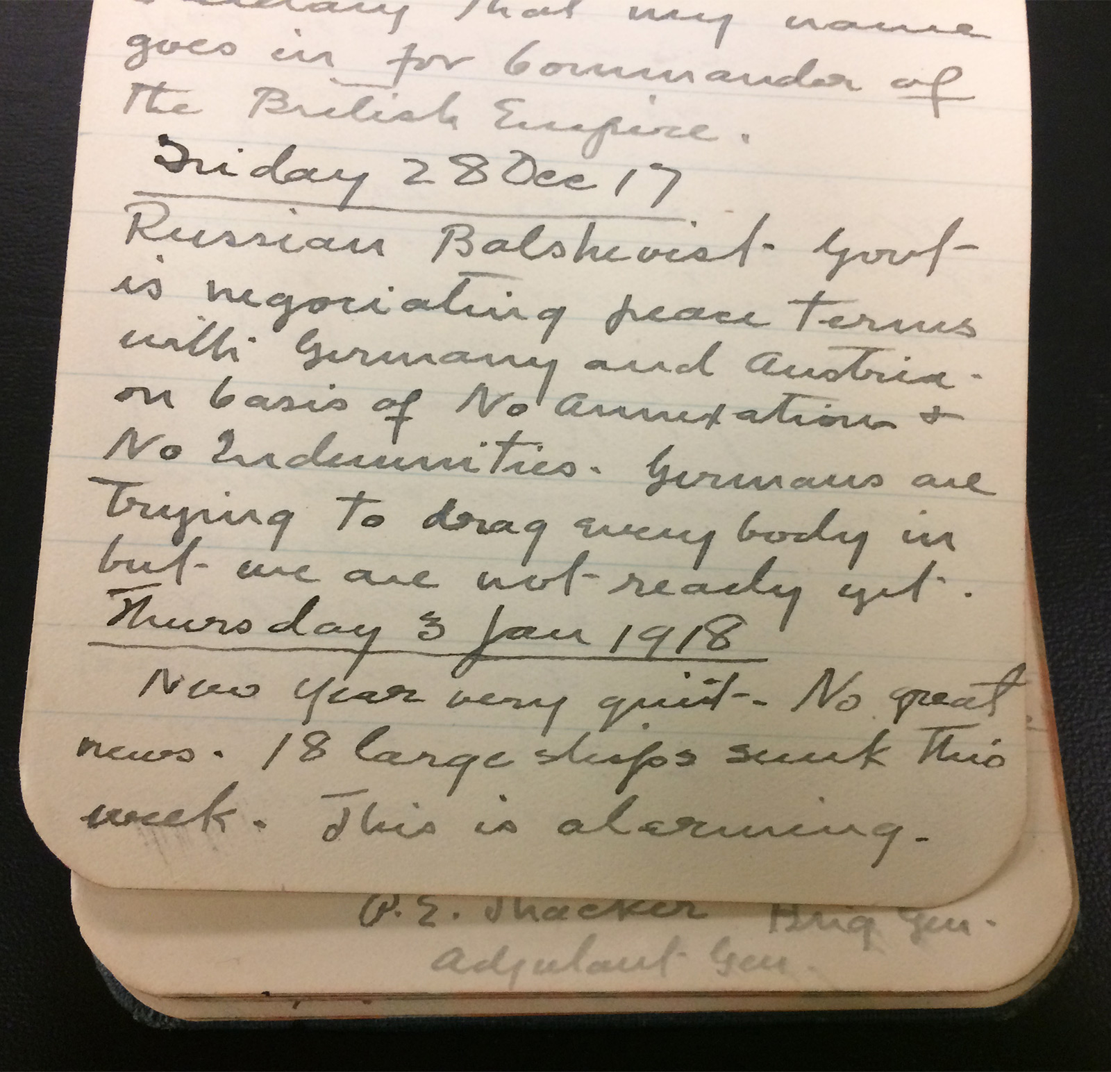 On 8 January 1918 Dennistoun learned that he had been made Commander of the Order of the British Empire (C.B.E.) in the New Year’s Honours for his wartime service. He transcribed several congratulatory letters that he received from senior military and government officials into his diary.