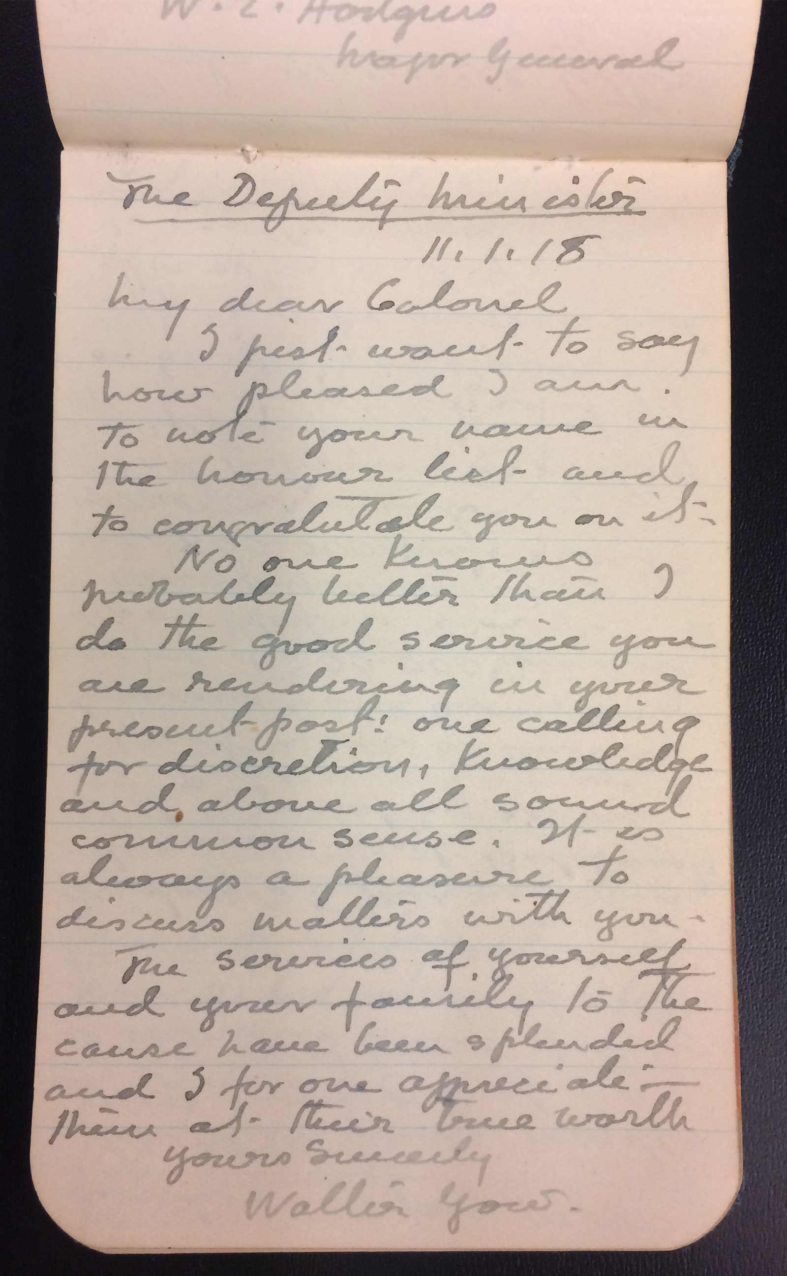 One was received from the Deputy Minister of Militia Walter Gow who wrote:
