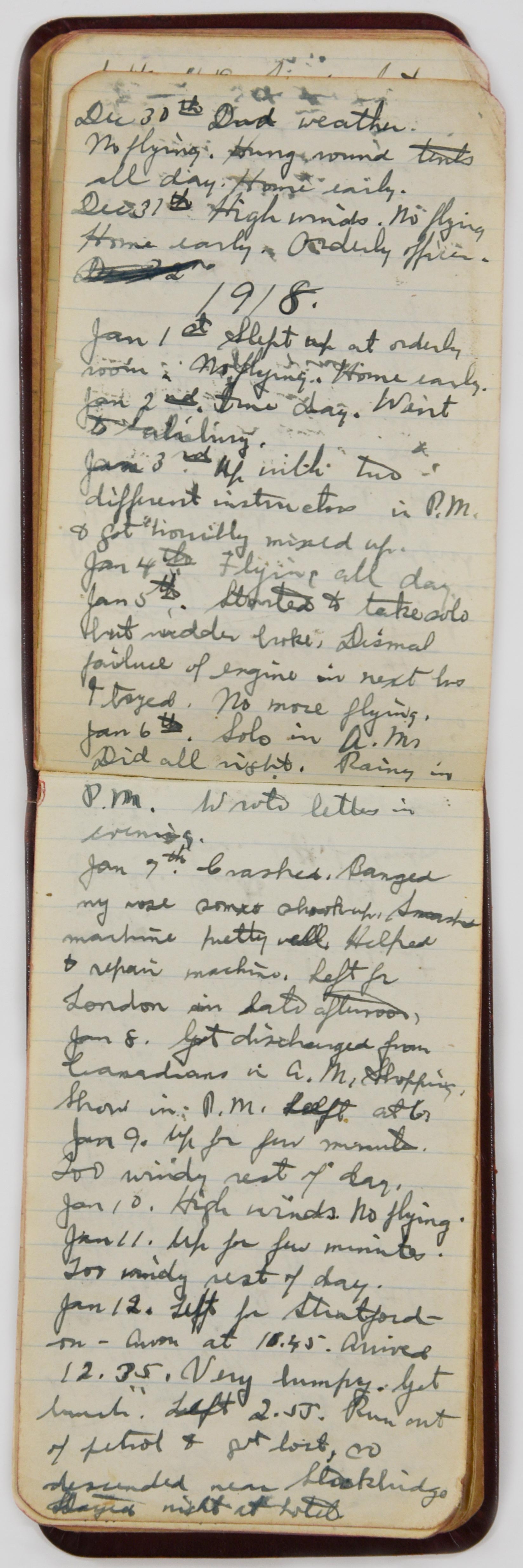 Uhlman wrote brief daily entries in a small notebook from the time he enlisted in May 1916 until 31 December 1918. His diary provides some insight into the life of a pilot in the early days of flight. He took his ground training through the fall and began flight training in December. He was ready for his first solo flight in early January.