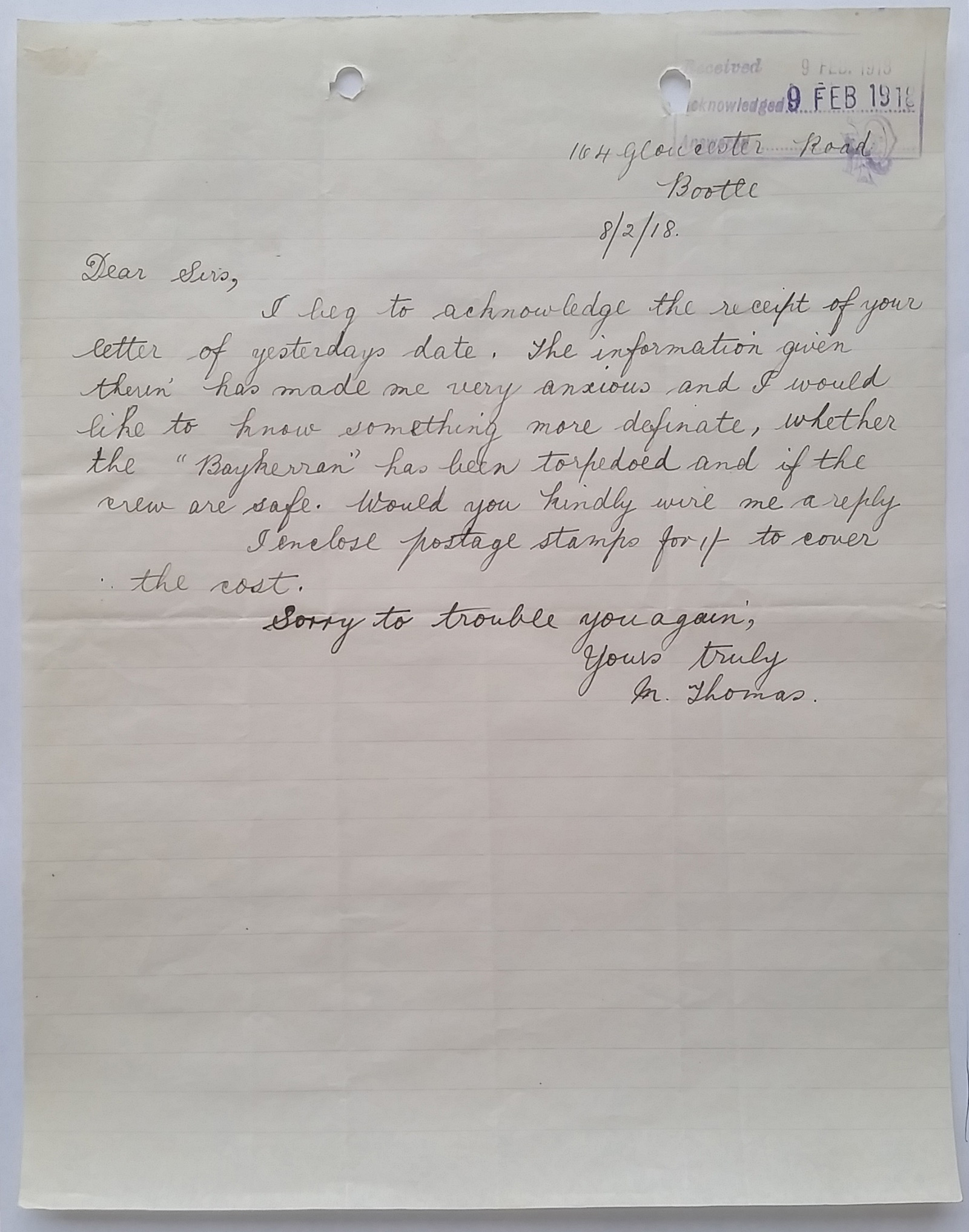 “Dear Sirs, I beg to acknowledge the receipt of your letter yesterdays date. The information given therein has made me very anxious and I would like to know something more definite, whether the Baykerran has been torpedoed and if the crew are safe. Would you kindly wire me a reply”