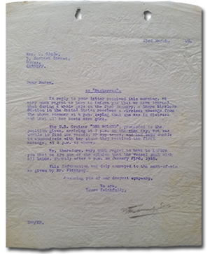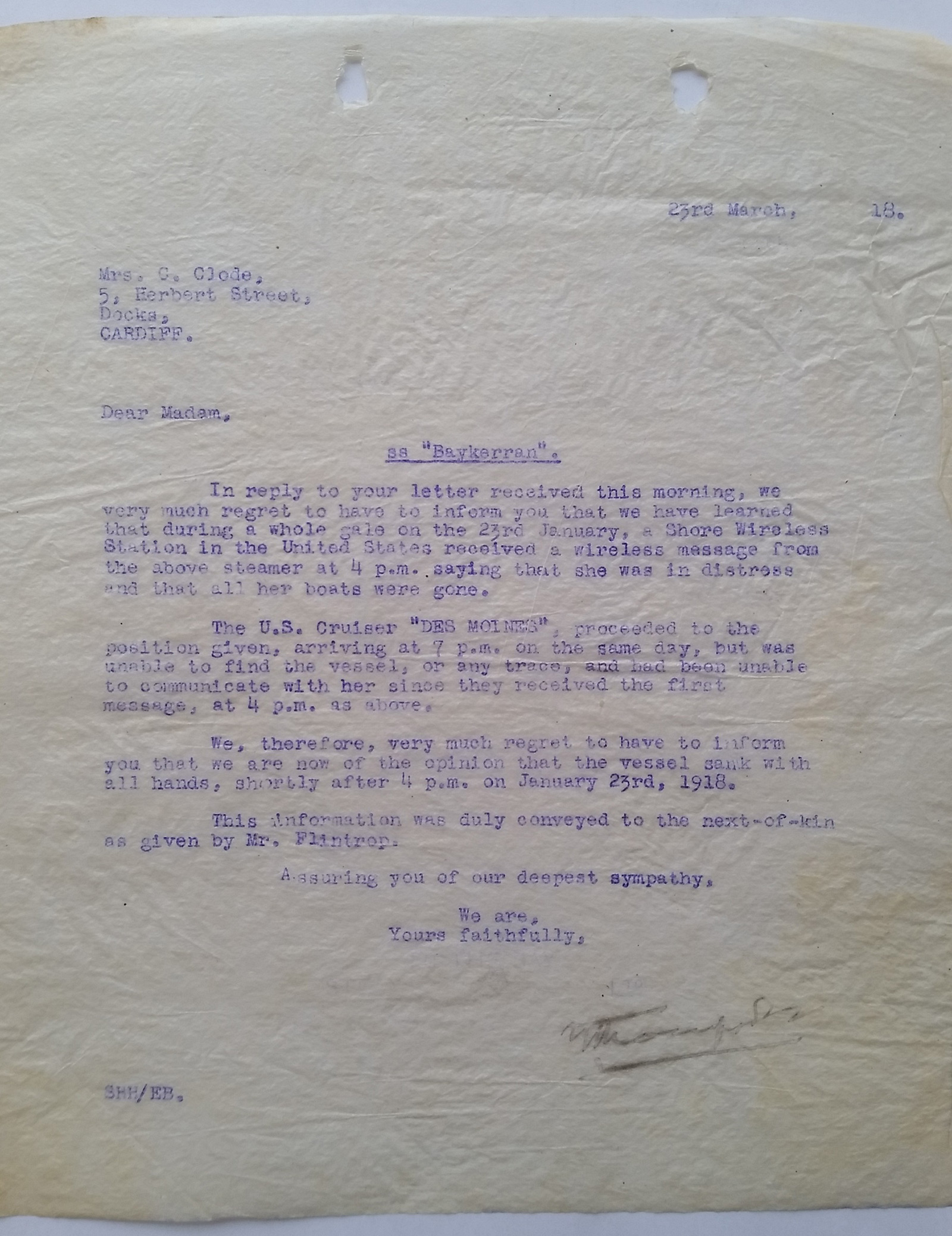 Two months after the ship sunk, the Bay Steamship Company was informing families of the detailed information they had accumulated of what happened on the day the Baykerran went missing. Mrs. C. Clode was sent the following letter on 23 March 1918.
