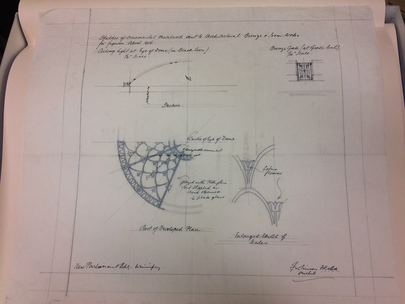 These records have been organized, cleaned and flattened (where necessary), foldered and listed and are now described and listed in our online Keystone database as Legislative Building architect’s files (A 0273, GR13326). These records include correspondence, drawings and estimates from suppliers, trades and artists involved in the design and construction of the Legislative Building including The J. McDiarmid Company Limited, The James Ballantyne Co., Otis-Fensom Elevator Co., Piccirilli Bros., Augustus Vincent Tack, Wallace Sandstone Quarries Ltd., Architectural Bronze & Iron Works Co., G. Gardet, The Office Specialty Manufacturing Co. Ltd., The Manitoba Bridge and Iron Works Limited, Cotter Bros., and Frank Brangwyn.