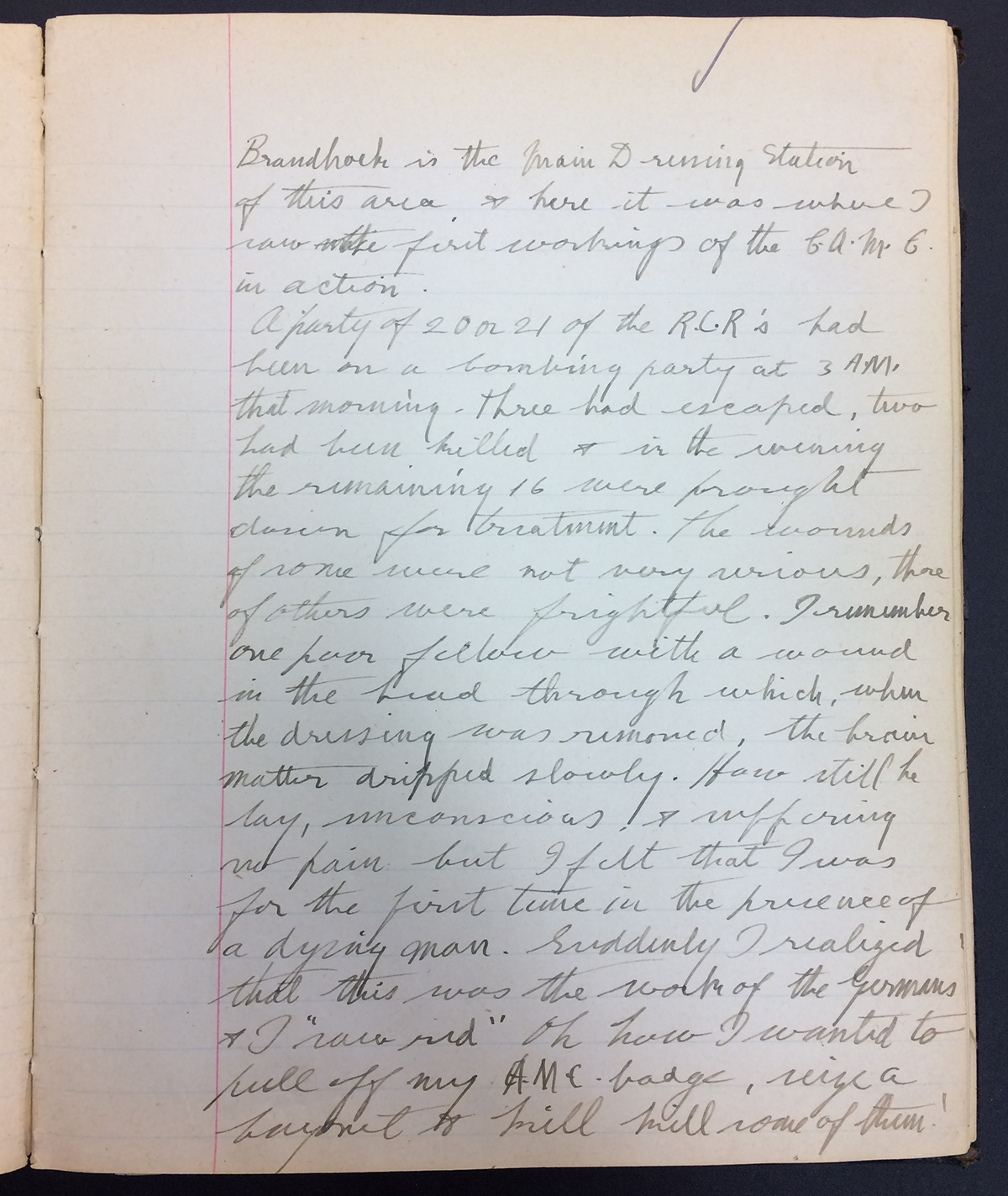 I remember one poor fellow with a wound in the head through which, when dressing was removed, the brain matter dripped slowly. How still he lay, unconscious and suffering no pain but I felt that I was for the first time in the presence of a dying man. Suddenly I realized that this was the work of the Germans. [illegible] oh how I wanted to pull off my A.M.C. badge, seize a bayonet and kill kill some of them!