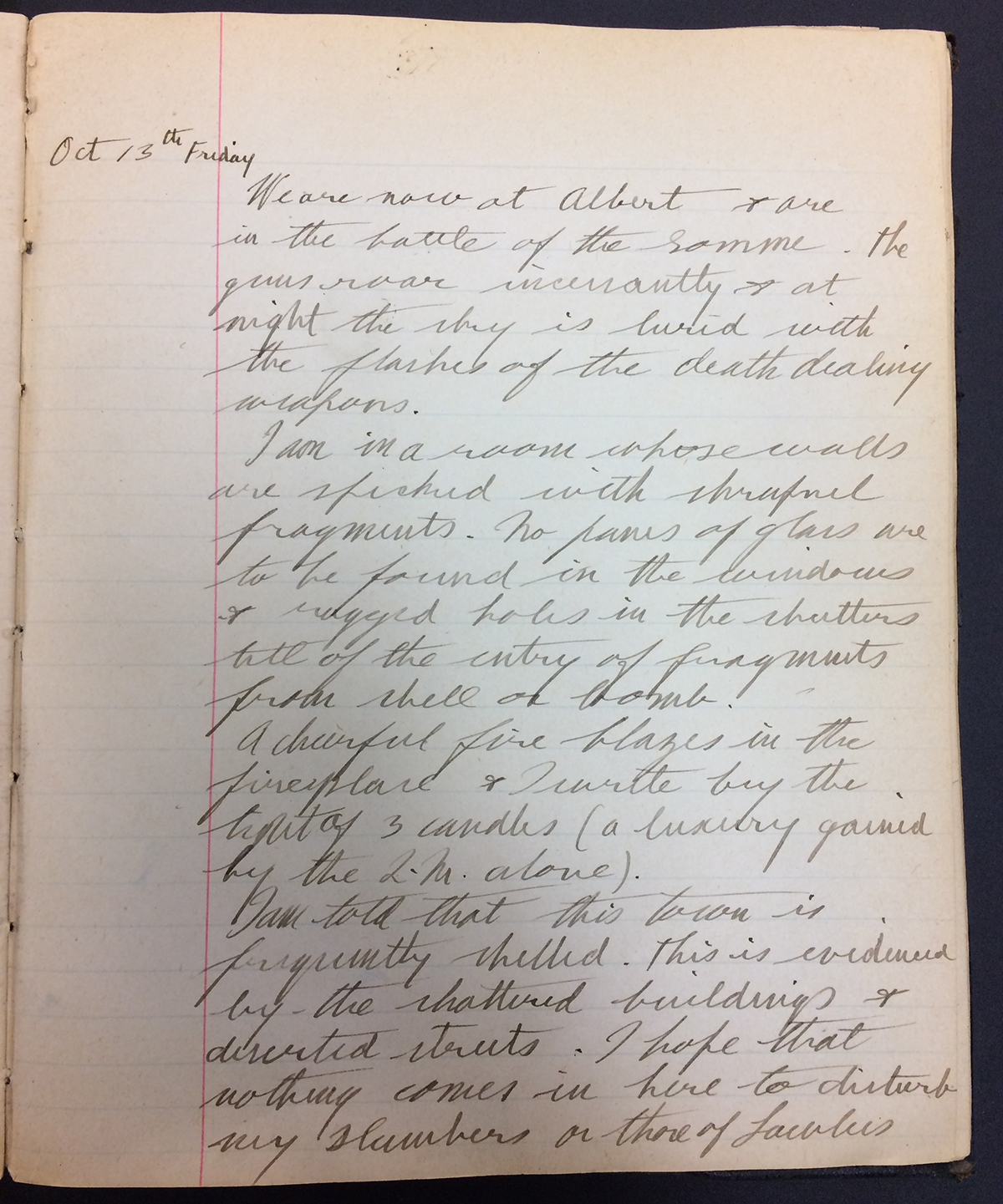 In October, his unit was transferred to the Battle of the Somme. In his entry for Friday, October 13th, he described his first night at the battlefield: