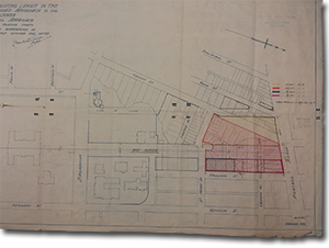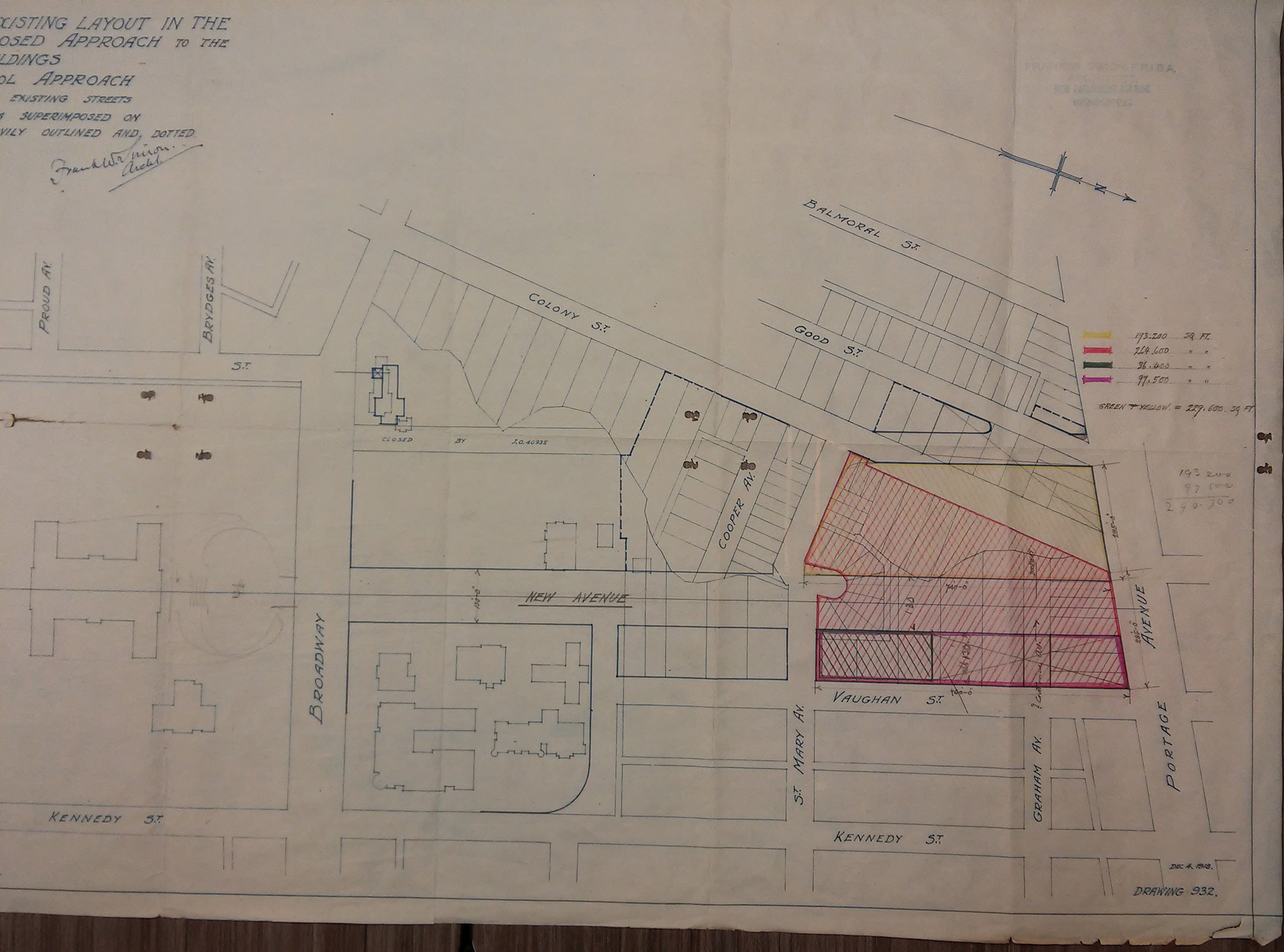 Hudson’s Bay Company Archives, Archives of Manitoba, Canadian Committee correspondence filed according to the Roneo System, portion of "Plan showing existing layout in the vicinity of proposed approach to the Parliament Buildings…," 1918, RG2/7/411 sheet 2.