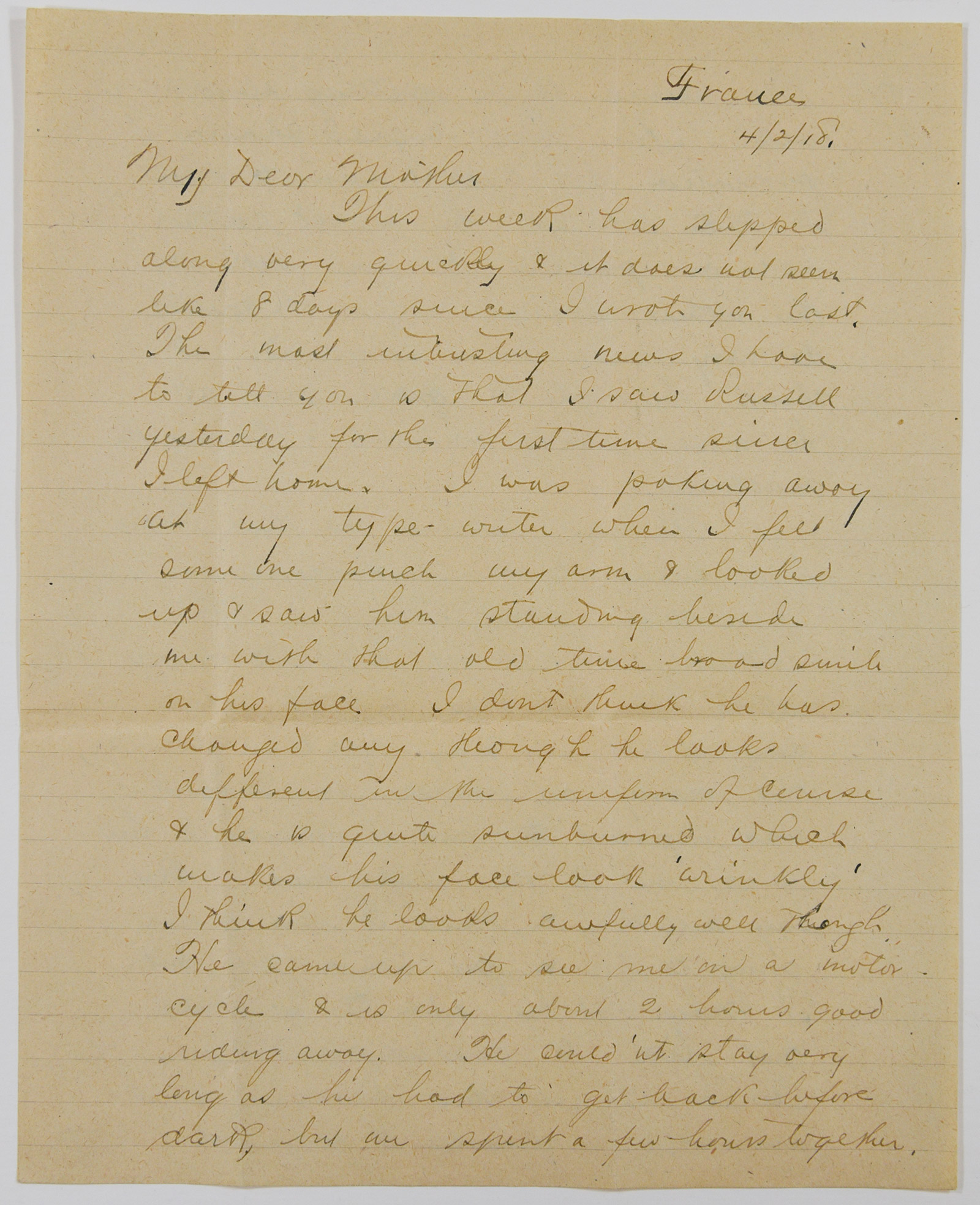 In a letter to his mother, dated 4 February 1918, Charles tells her about a surprise visitor he had the day before. He was working on his typewriter when he felt someone pinch his arm and he looked up and saw his brother Russell for the first time since he left home.