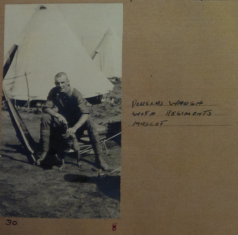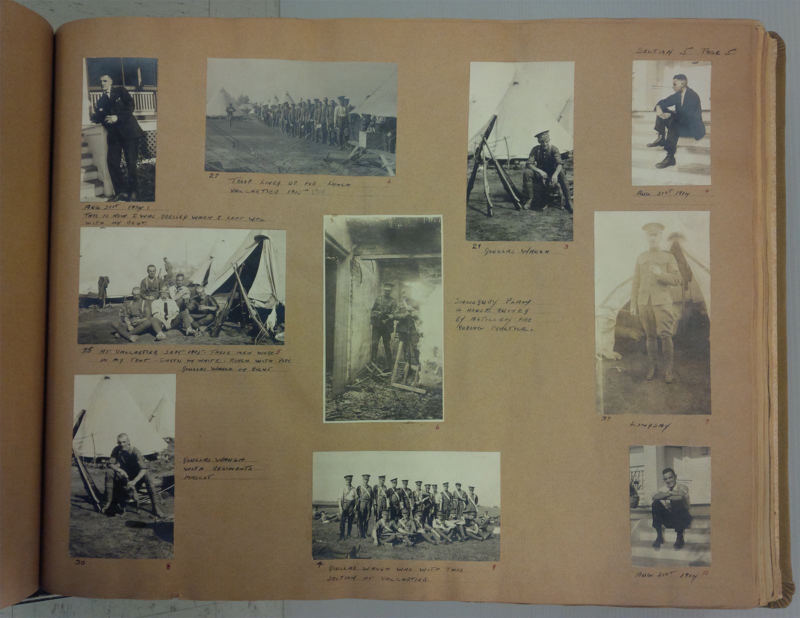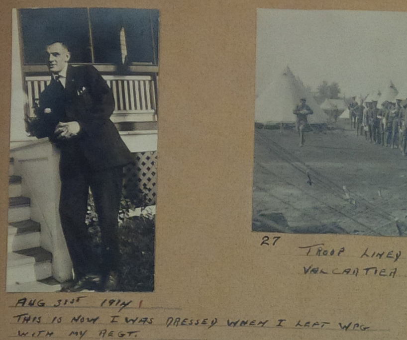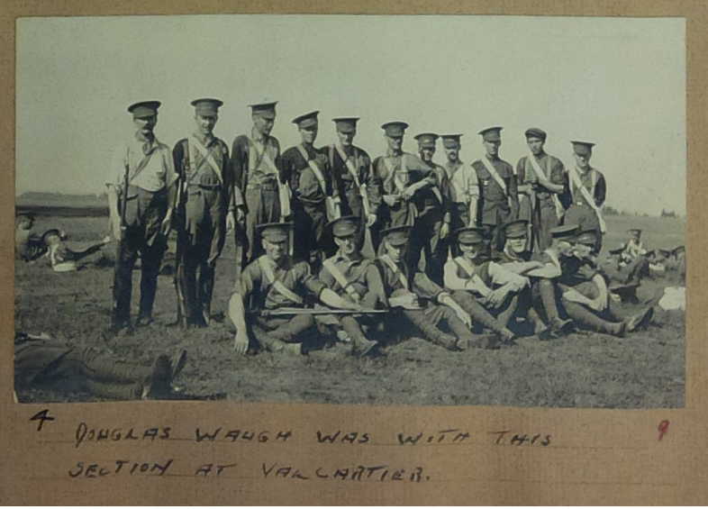 The section of the scrapbook devoted to Waugh’s military service includes 47 pages of photographs, documents and accompanying captions outlining his First World War service from the time Douglas Waugh enlisted on the third day of the war in 1914 to his return to Winnipeg in 1916.
