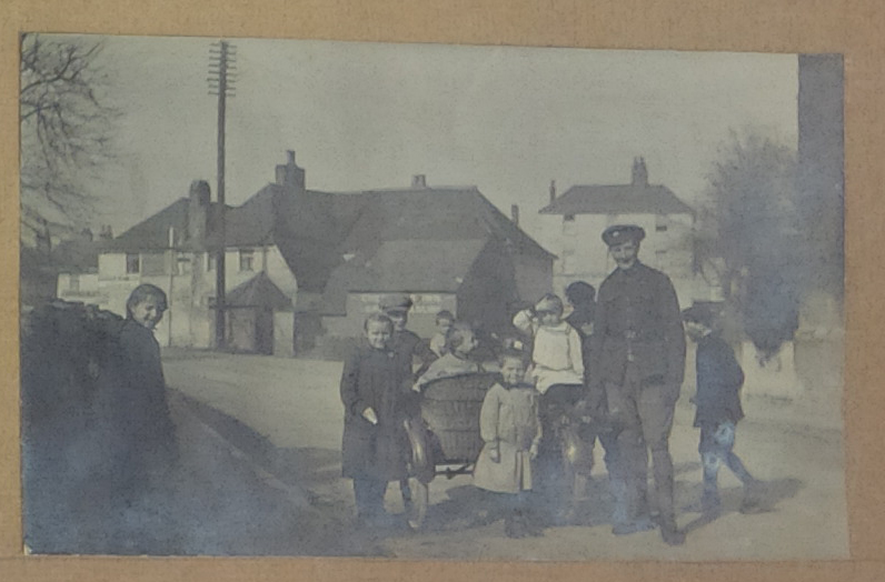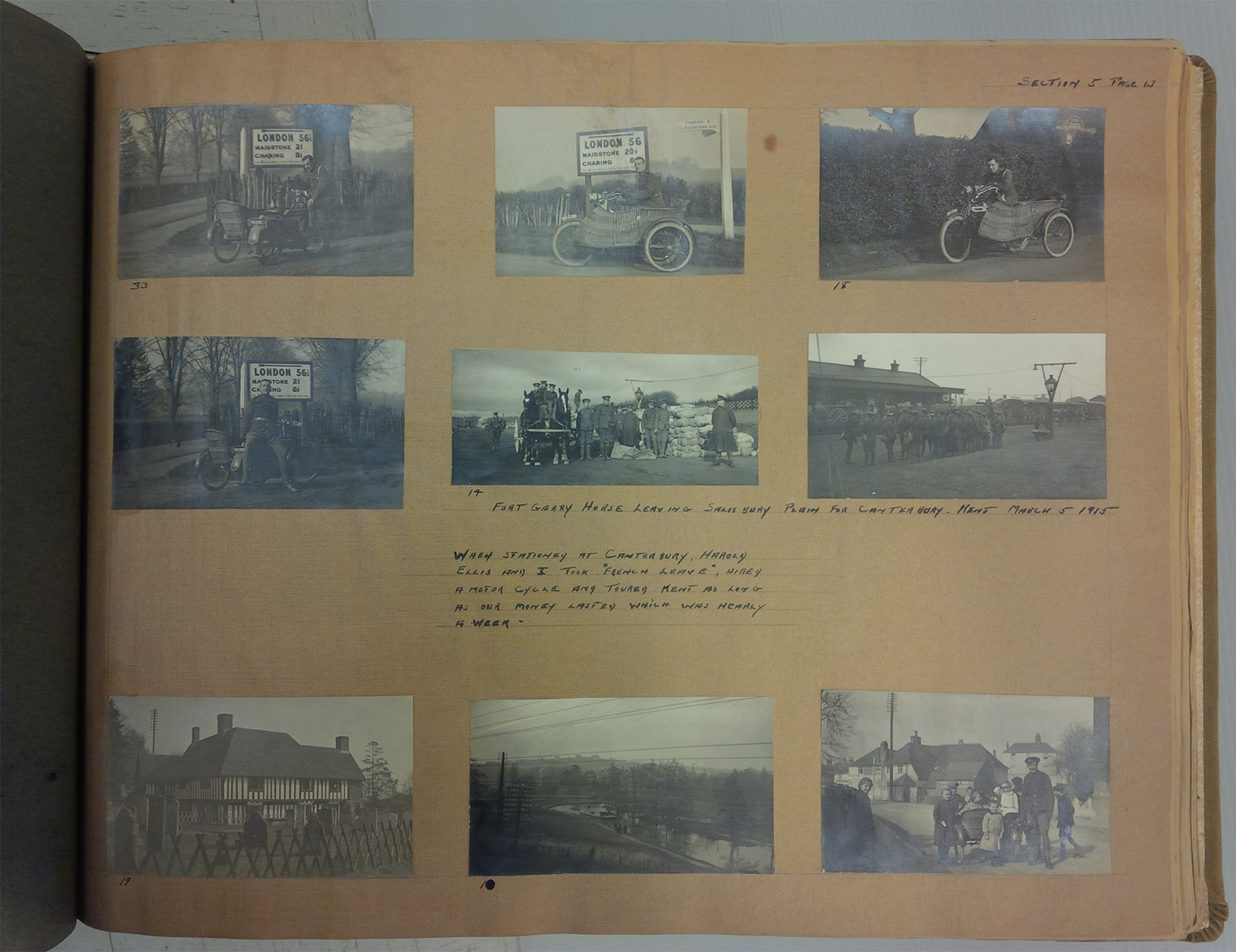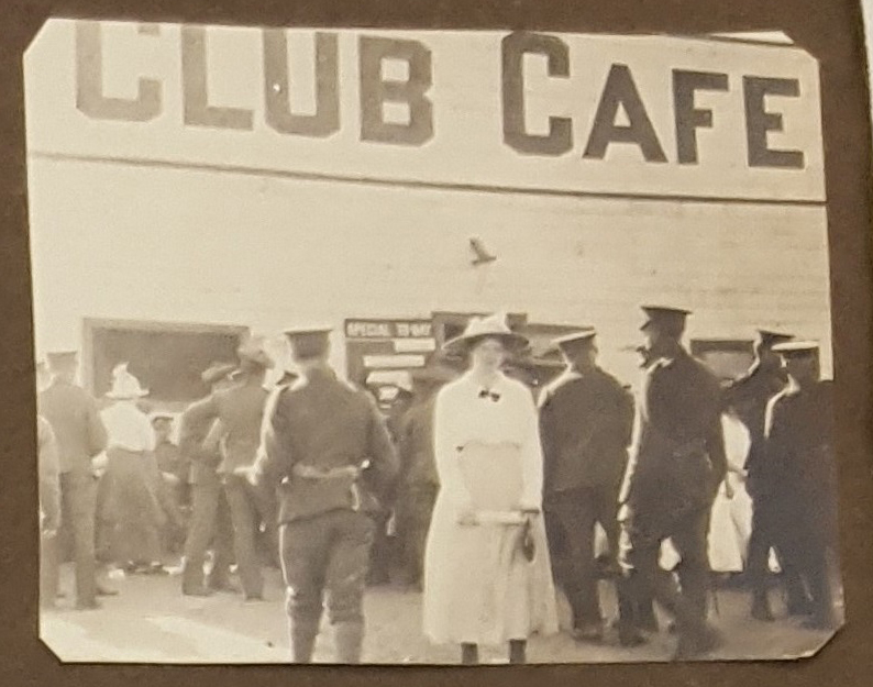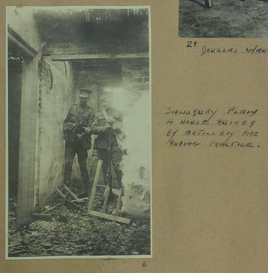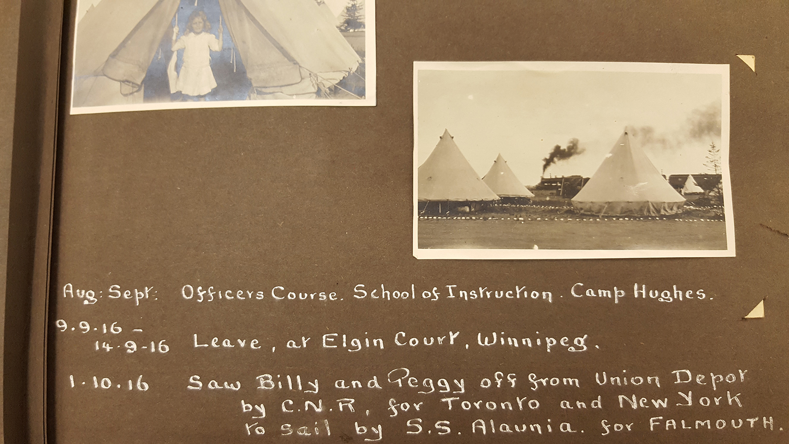 Collinson was originally with the 203rd Battalion but transferred to the 44th Battalion before being sent to Tramways Company Canadian Engineers as a Lieutenant in mid-1917. The scrapbook contains many images of his time training at Camp Hughes and in England before going to the frontlines in France. In one image, Collinson’s wife and child visited him at an officer’s training program in Camp Hughes.