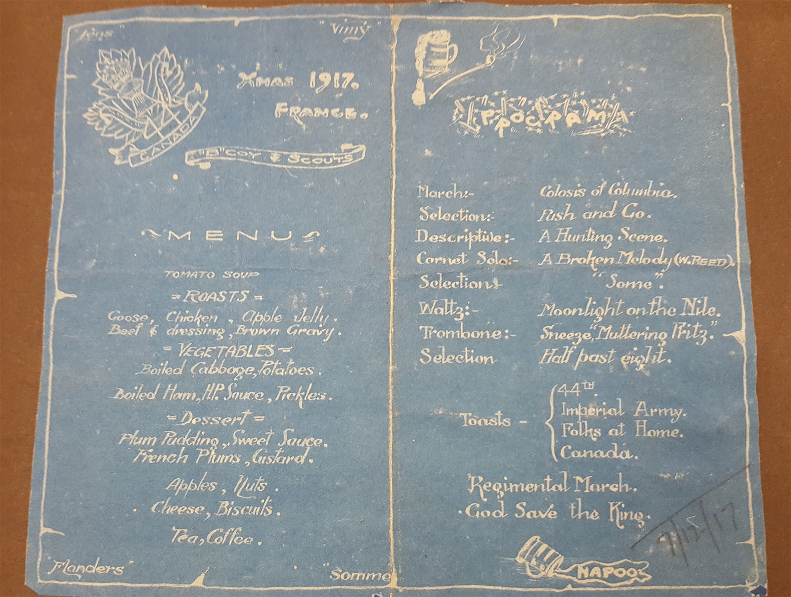 Collinson often wrote diary entries in his scrapbook noting where he went and would sometimes paste sketches and written notes about what he did during the day. In one entry, he helped prepare Christmas dinner for his men in 1917.