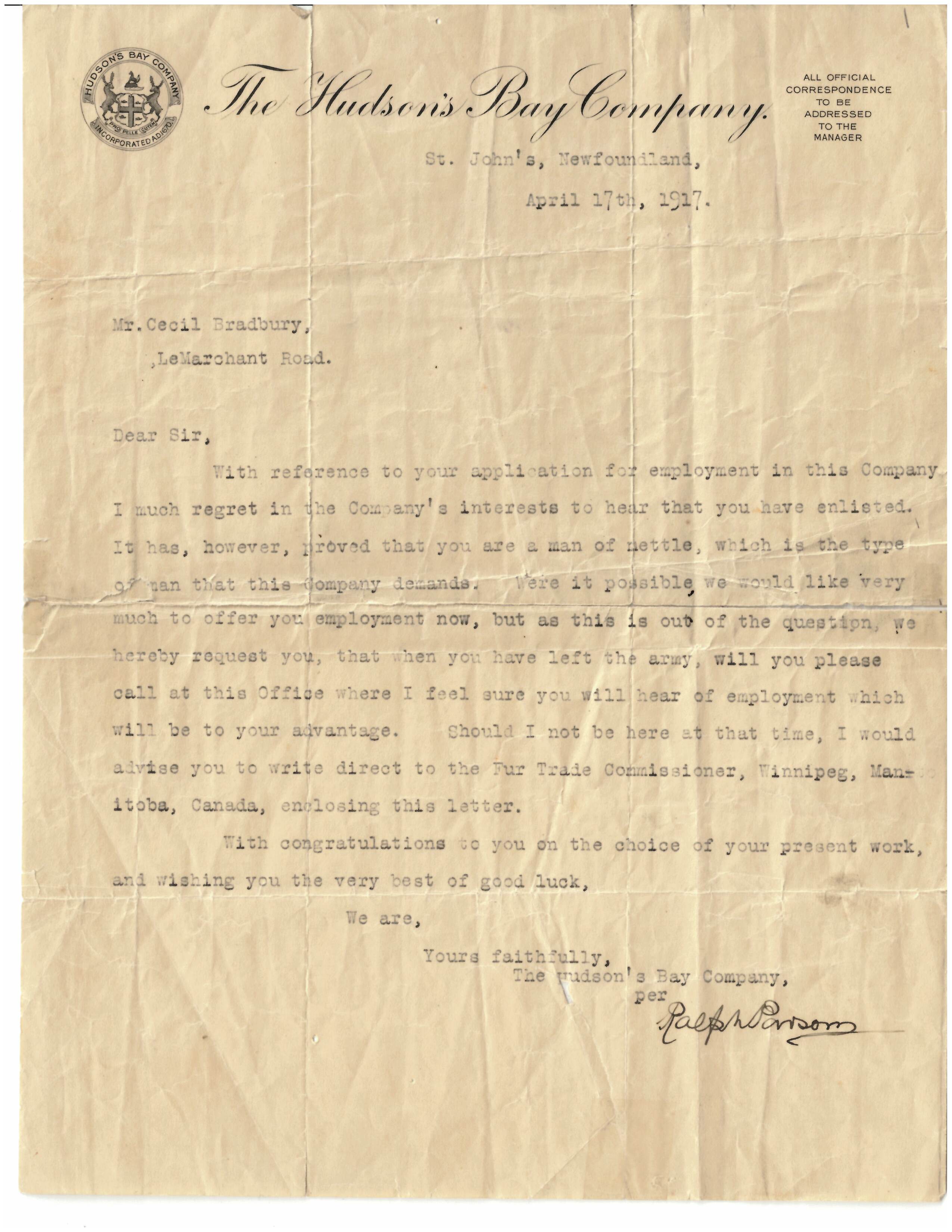 The First World War interrupted the careers of many young men, such as Cecil Bradbury. Born in 1901 in St. John's, Newfoundland, Bradbury applied to work for the Hudson’s Bay Company (HBC) at the age of 16. However, shortly after applying, he enlisted to go overseas with the Royal Newfoundland Regiment.