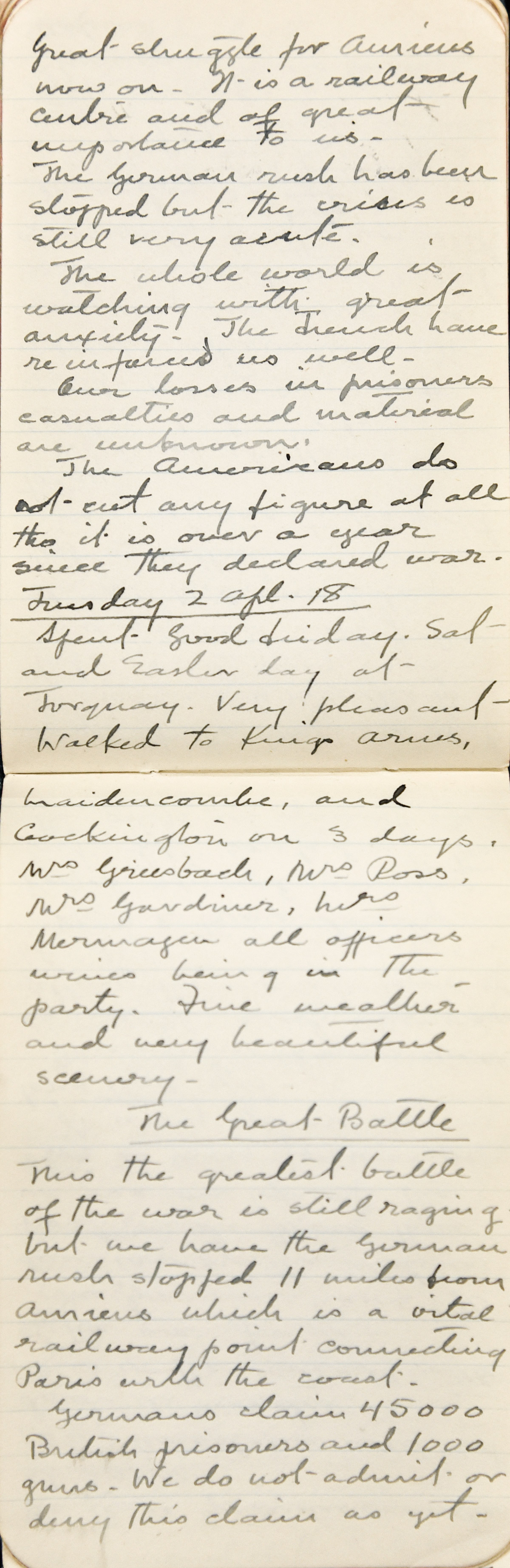 Dennistoun’s diary entries are short but capture the intensity of the time. On 2 April 1918, Dennistoun writes again of this “greatest battle” and the involvement of the Canadians and Americans: