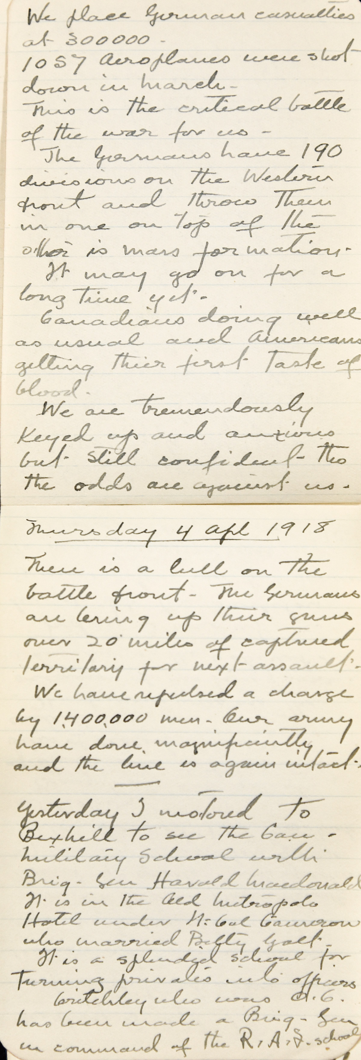 This the greatest battle of the war is still raging but we have the German rush stopped 11 miles from Amiens which is a vital railway point connecting Paris with the coast….Canadians doing well as usual and Americans getting their first taste of blood. We are tremendously keyed up and anxious but still confident tho the odds are against us.