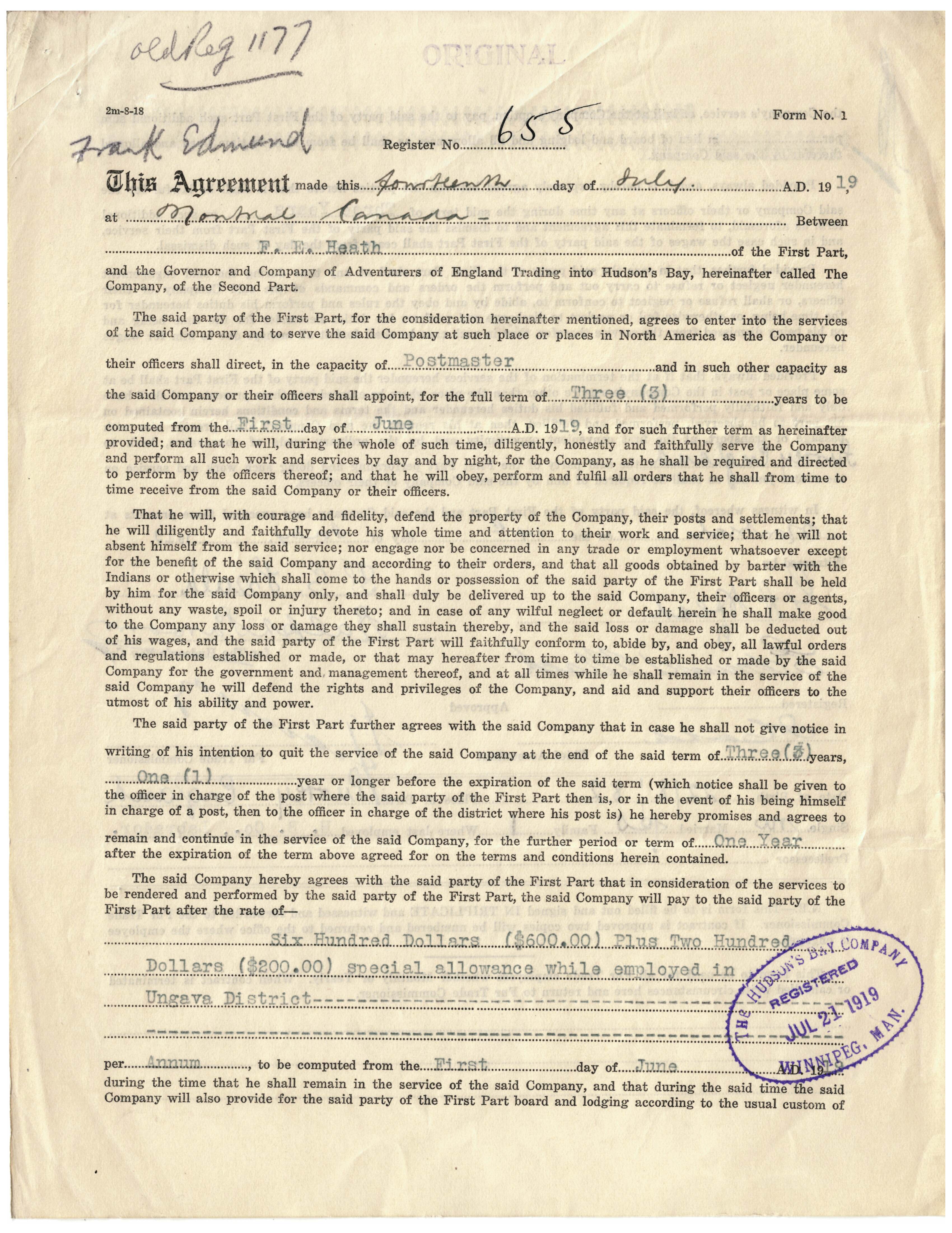In 1919, Heath resumed his career with HBC, signing a contract to work as a postmaster, also known as a post manager.