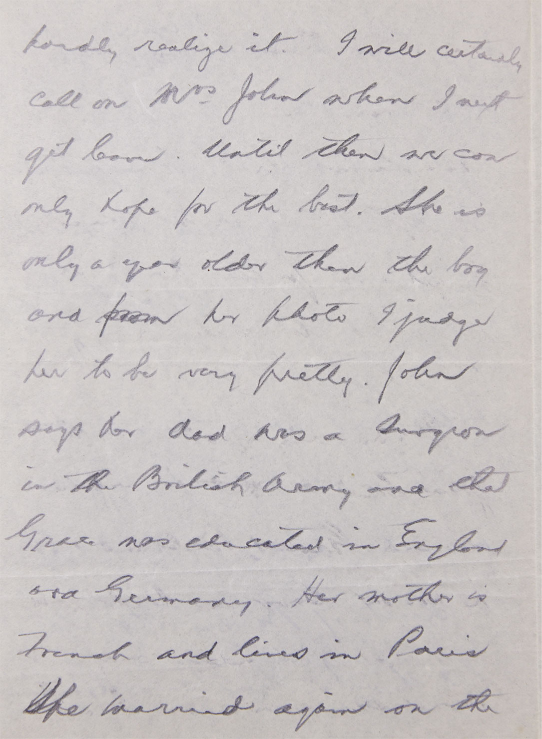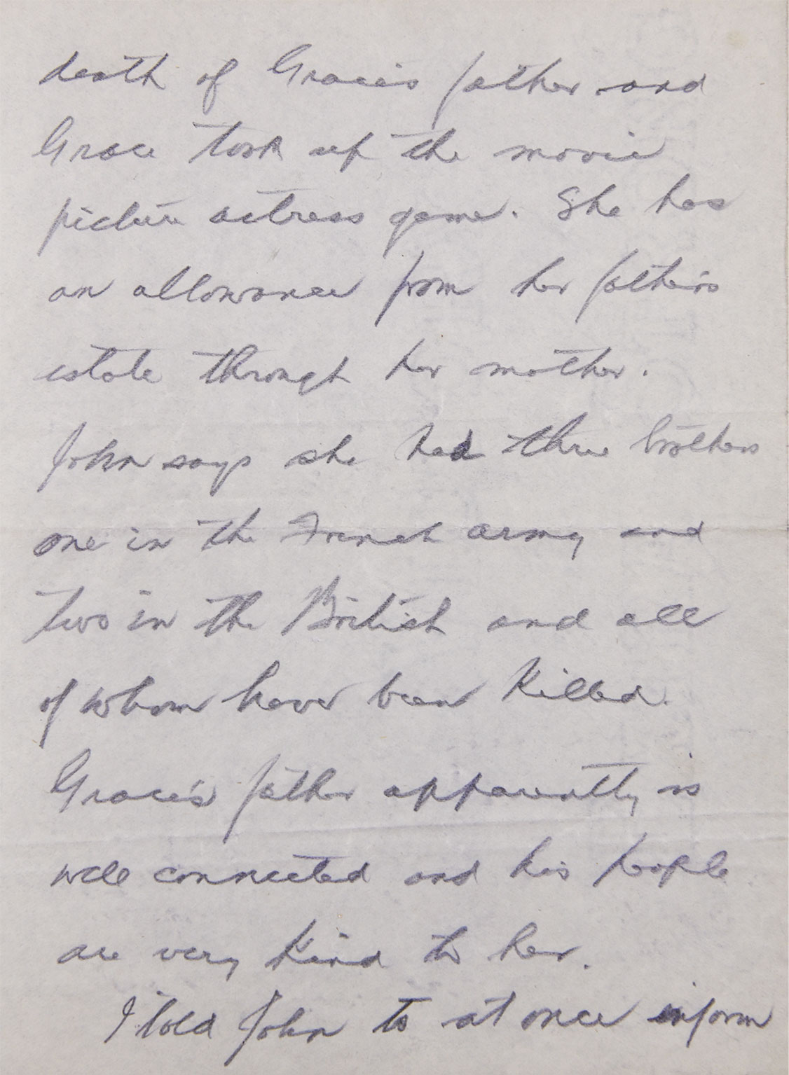 It was only yesterday that John told me that he had married Grace Ballard when he was on leave in October last. It was a tremendous surprise to me and even now I can hardly realize it. I will certainly call on Mrs. John when I next get leave. Until then we can only hope for the best. She is only a year older than the boy and from her photo I judge her to be very pretty. John says her dad was a Surgeon in the British Army and that Grace was educated in England and Germany. Her mother is French and lives in Paris. She married again on the death of Grace’s father and Grace took up the movie picture actress game. She has an allowance from her father’s estate through her mother. John says she had three brothers one in the French army and two in the British and all of whom have been killed. Grace’s father apparently is well connected and his people are very kind to her.