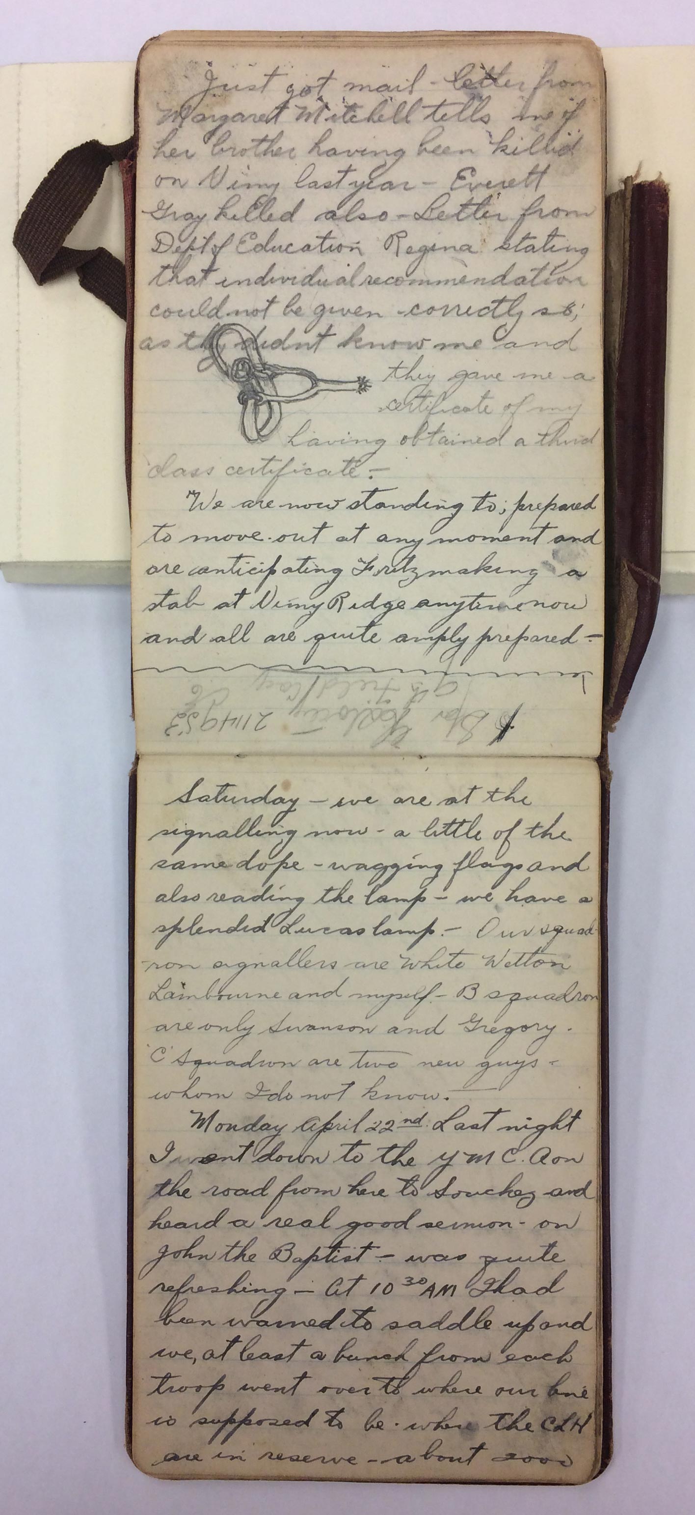 We are now standing to; prepared to move out at any moment and are anticipating Fritz making a stab at Vimy Ridge anytime now and are quite amply prepared.-