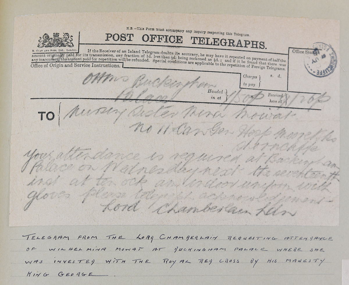 handwritten telegram in scrapbook. “Buckingham Palace. Nursing Section Mina Mowat. No 11 Can Gen Hosp Moore Shorncliffe. Your attendance is required at Buckingham Palace on Wednesday next the seventeenth  inst at ten ock indoor uniform with gloves please telegraph acknowledgement. Lord Chamberlain Ldn.” The caption in the scrapbook is “Telegram from the Lord Chamberlain requesting attendance of Wilhelmina Mowat at Buckingham Palace where she was invested with the Royal Red Cross by His Magesty King George.”