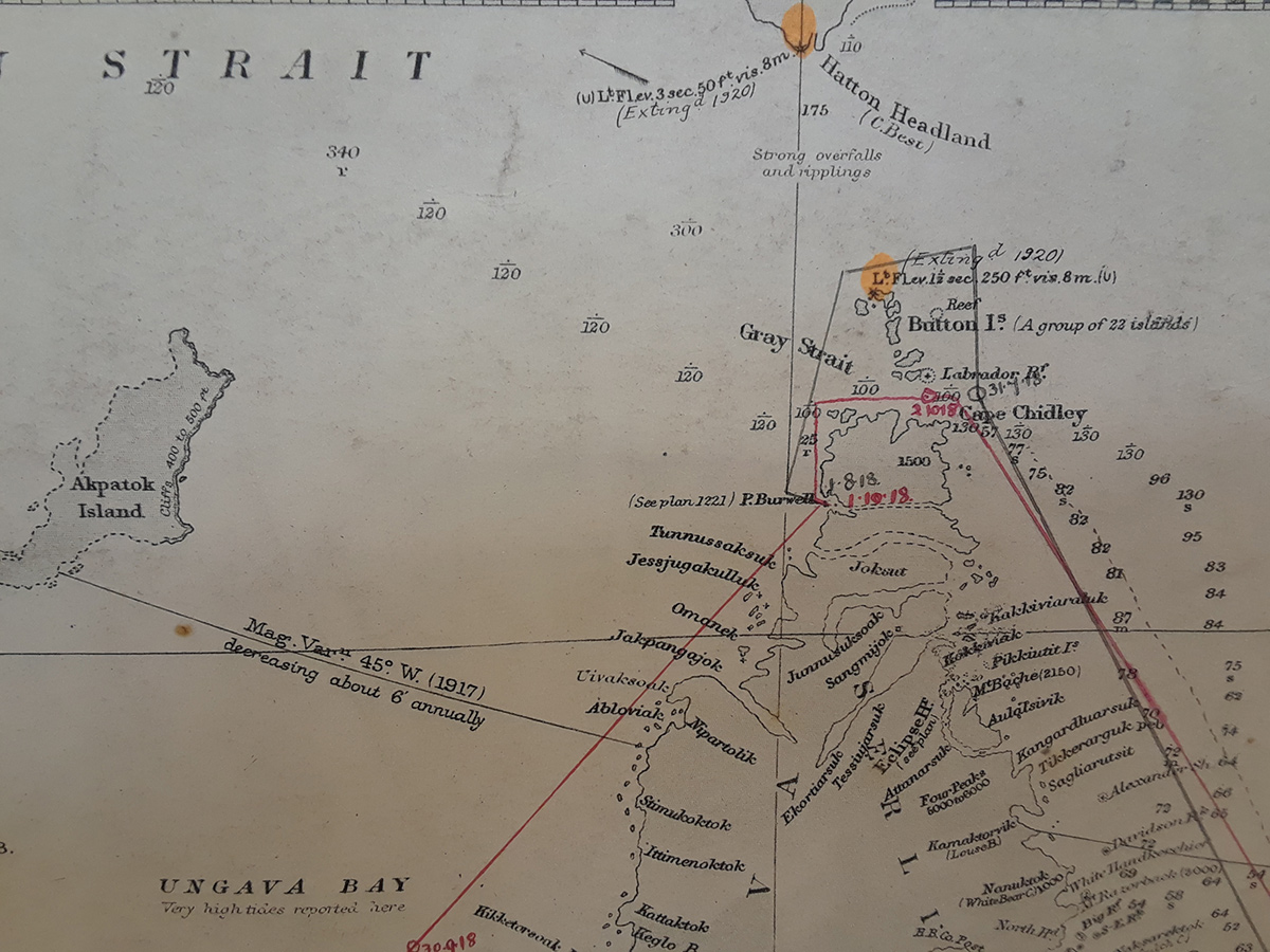 Hudson’s Bay Company Archives, Archives of Manitoba, Hudson’s Bay Company Archives published maps and atlases collection, portion of track chart for Nascopie, 1918, HBCA G.5/34/1.