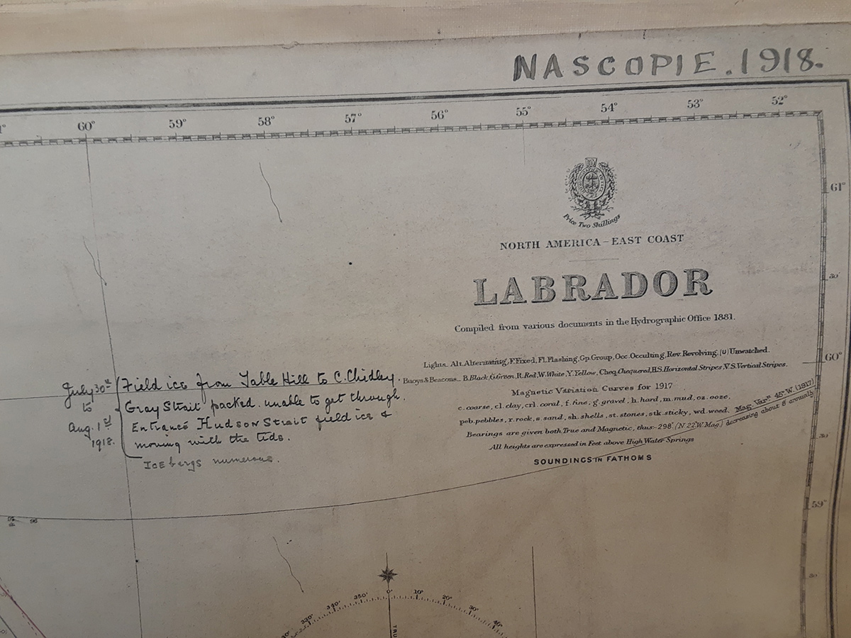 close up of top of map of Labrador, with handwritten note “July 30th to Aug. 1st 1918 { Field ice from Table Hill to C. Childey Gray Strait packed. Unable to get through. Entrance Hudson Strait field ice and moving with the tide. Icebergs numerous.”