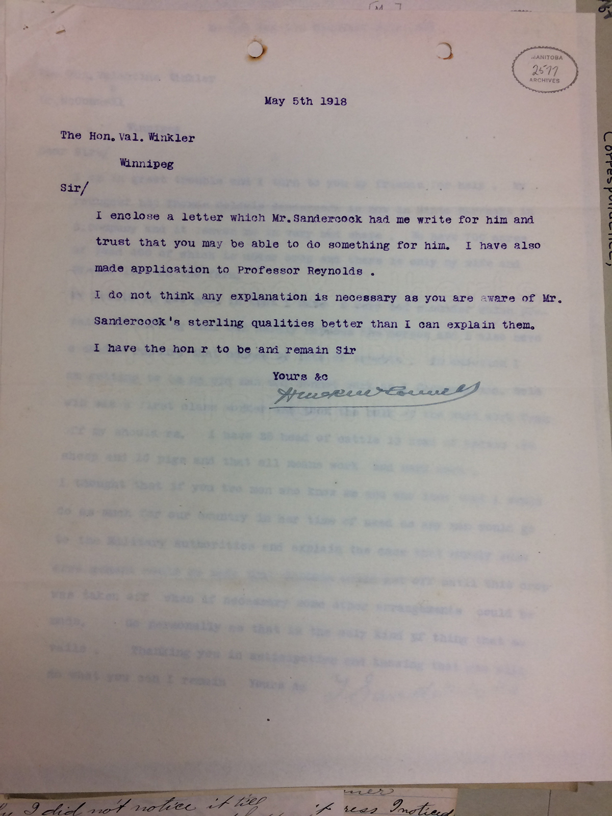 Letter from Dr. McConnell to The hon. Wal Winkler, dated May 5th 1918. Sir/ I enclose a letter which Mr. Sandercock had me write for him and trust that you may be able to do something for him. I have also made application to Professor Reynolds. I do not think any explanation is necessary as you are aware of Mr. Sandercock's sterling qualities better than I can explain them. I have the honor to be a remain Sir, Yours &c.