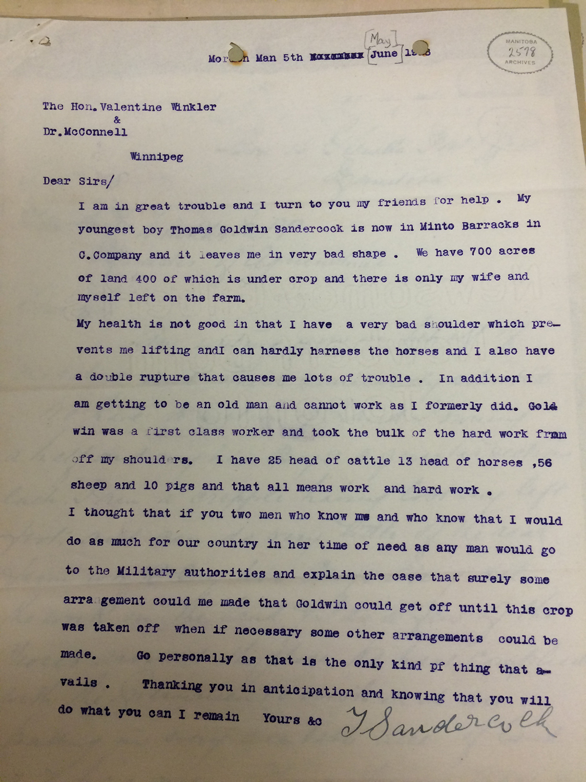 Letter from T. Sandercock to The Hon. Valentine Winkler and Dr. McConnell. Dear Sirs/ I am in great trouble and I turn to you my friends for help. My youngest boy Thomas Goldwin Sandercock is now in Minto Barracks in C. Company and it leaves me in very bad shape. We have 700 acres of land 400 of which is under crop and there is only my wife and myself left on the farm. my health is not good in that I have a very bad shoulder which prevents me lifting and I can hardly harness the horses and I also have a double rupture that causes me lots of trouble. In addition I am getting to be an old man and cannot work as I formerly did. Goldwin was a first class worker and took the bulk of the hard work from off my shoulders. I have 25 head of cattle 13 head of horses, 56 sheep, and 10 pigs and that all means work and hard work. I thought that if you two men who know me and who know that I would do as much for our country in her time of need as any man would go to the Military authorirites and explain the case that surely some arrangement could be made that Goldwin could get off until this crop was taken off when if necessary some other arrangements could be made. Go personally as that is the only kind of thing that avails. Thanking you in anticipation and knowing that you will do what you can I remain yours &c.