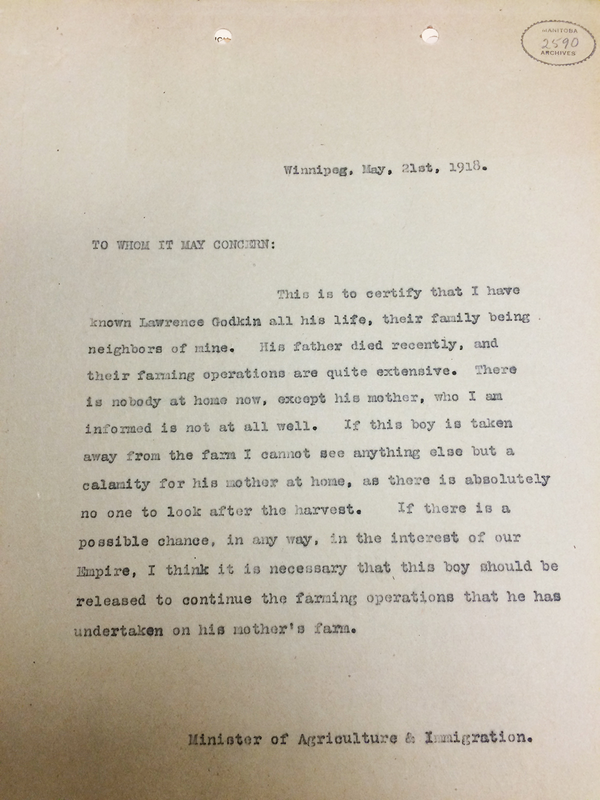 Letter from Valentine Winkler. Winnipeg, May, 21st, 1918. TO WHOM IT MAY CONCERN: This is to certify that I have known Lawrence Godkin all his life, their family being neighbors of mine. His father died recently, and their farming operations are quite extensive. There is nobody at home now, except his mother, who I am informed is not at all well. If this boy is taken away from the farm I cannot see anything else but a calamity for his mother at home, as there is absolutely no one to look after the harvest. If there is a possible chance, in any way, in the interest of our Empire, I think it is necessary that this boy should be released to continue the farming operations that he has undertaken on this mother's farm. Minister of Agriculture and Immigration.
