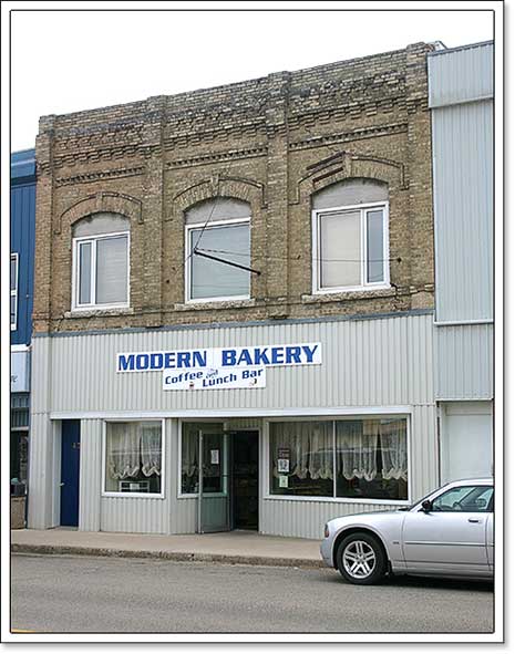 Designation Date: June 12, 2007 The Modern Bakery, a well-proportioned Romanesque Revival structure situated in the midst of an impressive collection of its contemporaries, is a fine example of a pre-1900 brick business block that still performs yeoman’s service in Historic Downtown Carberry, a designated heritage district. Built in the late 1890s, the building displays the essence of its early aesthetics, most evident in the intricately detailed brickwork of its upper facade and in its wide single storefront. In function this facility also maintains a central role in the town’s business and social life, having housed for many decades a bakery and cafe operated by the prominent John Crich and Dick Appel families, among others. |