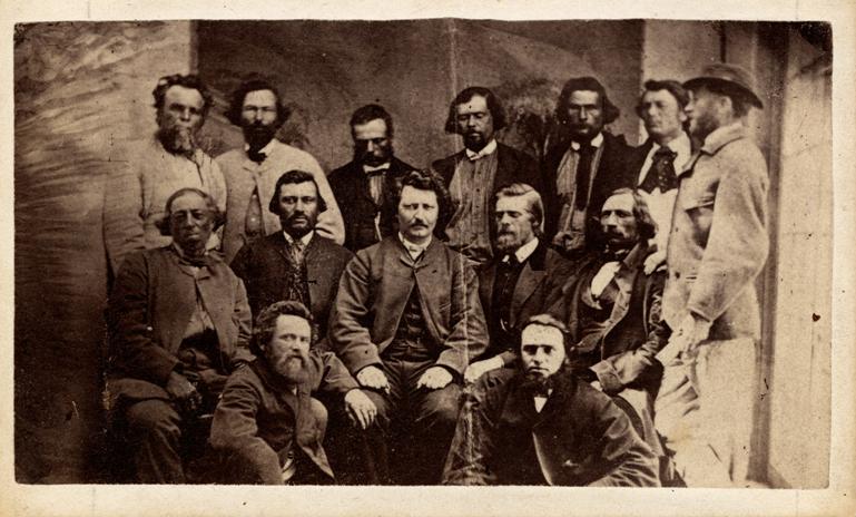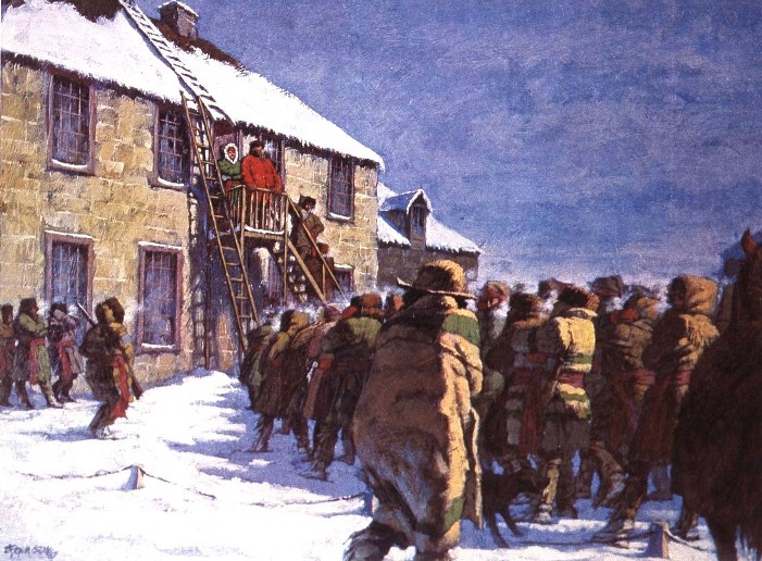 On November 2, 1869, Louis Riel and his followers took possession of the Hudson's Bay Company's Upper Fort Garry, and later they formed a Provisional Government with Riel as President. To handle this complex problem Prime Minister John A. Madonald appointed Donald A. Smith of the Hudson's Bay Company “Special Commissioner, to enquire into and report upon the causes and extent of the armed obstruction offered at the Red River…” This painting shows part of the crowd of 1,000 who assembled on January 19, 1870, to hear Donald Smith, who was accompanied by Louis Riel, explain his commission.