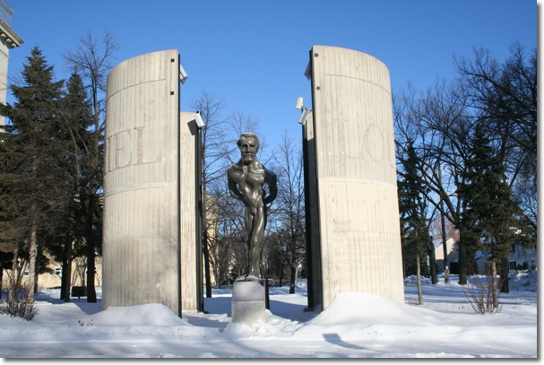 The original statue commemorating Louis Riel was erected on the grounds of the Legislative Building in 1971, in honour of Manitoba's Centennial, the previous year. An artistic abstract sculpture within a cylindrical structure, it depicts Riel's tortured soul, and was created by Marcien Lemay and Etienne Gaboury. It was controversial to many, who desired a more statesmanlike depiction. It was replaced in 1996 and moved to the grounds of St. Boniface College, 200 ave de la Cathédrale.