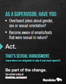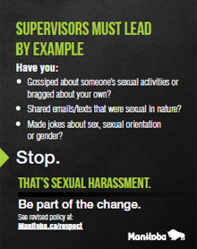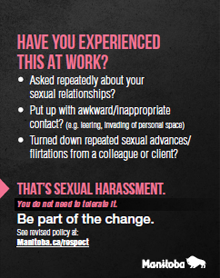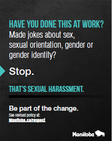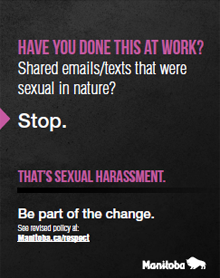 The Manitoba government has launched a series of posters to raise awareness about sexual harassment in the workplace. The campaign responds to what was heard during consultations about sexual harassment in the workplace held in spring 2018 and the posters were developed with input from employees across government. The campaign aims to help employees recognize what actions constitutes sexual harassment, inform supervisors about their responsibility to address sexual harassment, and direct employees to the reporting options available and the internet site with the revised policy and supporting resources.