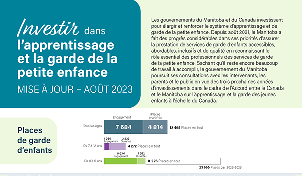 En août 2021, les gouvernements du Canada et du Manitoba ont signé le nouvel Accord sur l’apprentissage et la garde de jeunes enfants à l’échelle du Canada. Cet accord prévoit un investissement fédéral de 1,2 milliard de dollars sur cinq ans de 2021-2022 à 2025-2026 afin de réduire les coûts des garderies autorisées pour les familles et d’élargir l’accès à des places de garde d’enfants de qualité et inclusives pour les enfants âgés de moins de sept ans.