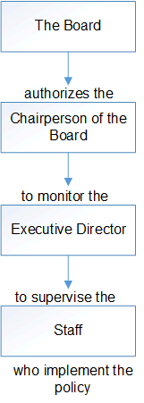 The example below is from the Access Network, Board Development Learner Manual, The Alberta Educational Communication Corp. 1988, and shows the line of authority and accountability from a policy governing board.