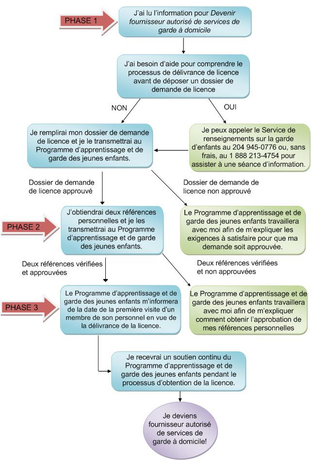 Après avoir lu de l’information sur le processus menant à l’obtention d’une licence de fournisseur de services de garde à domicile, je suis prêt à présenter une demande. Si je souhaite obtenir un complément d’information ou m’inscrire à une séance d’information à Winnipeg, je peux communiquer avec le Service de renseignements sur la garde d’enfants en appelant le 204 945‑0776 ou, sans frais, le 1 888 213-4754, ou encore par courriel à cdcinfo@gov.mb.ca. Si je réside hors de Winnipeg, je peux m’adresser à mon coordonnateur des services de garderie, qui me renseignera plus avant, au lieu d’assister à la séance d’information.