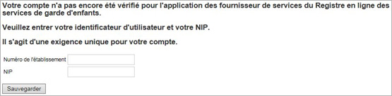 Entrez le Numéro de l’établissement et le NIP (numéro d’identification personnel) que vous avez reçu dans l’invitation à utiliser le Registre en ligne des services de garde d’enfants que vous avez reçue.