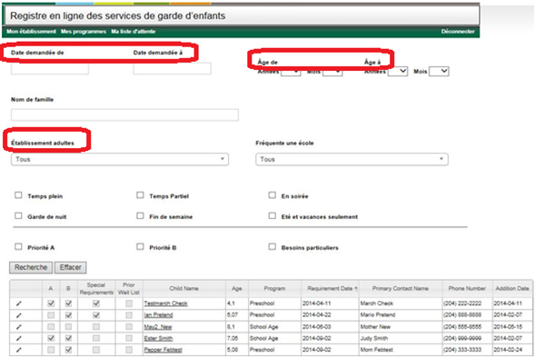 En utilisant un filtre, vous pourrez voir uniquement une portion de votre liste d’attente. Cette fonction est utile quand vous avez une place de garderie particulière à remplir ou quand vous devez chercher un enfant qui répond à certains critères. Après avoir réglé vos filtres, cliquez sur le bouton « Recherche » afin d’appliquer ces critères de recherche à votre liste. Lorsque vous voulez voir votre liste au complet, éliminez tous les filtres en cliquant sur « Effacer », puis cliquez de nouveau sur « Recherche ».