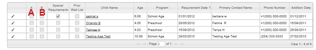 Priorité A/B : Ce sont des cases à cocher personnalisables qui vous permettent de mettre en relief certains enfants de votre liste (par ex., un enfant qui a un frère ou une sœur dans votre garderie et qui a la priorité si une place se libère).