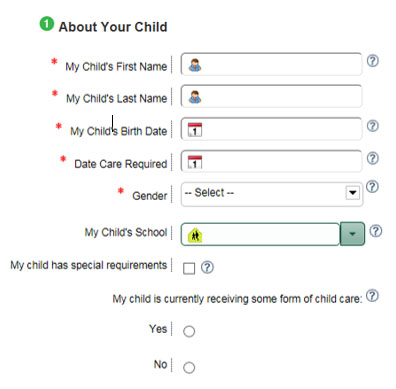 The child’s first and last name, birth date, date care required, and gender (sex), are all fields you must fill in. The age your child will be on the date care is required, determines what program your child is eligible for.