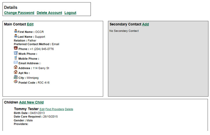 Once you are logged in, you can change your password, delete your account, make changes to the primary and secondary contacts and add a new child. Simply click the action you would like to take and update the information. The Edit button next to your child’s name allows you to view and update your child’s information.