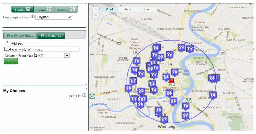 - Find Close By: You must enter one address and a Distance From You (ex: one kilometre). This will show all eligible providers within an area around the address you have entered (ex: your home, work place or child’s school).